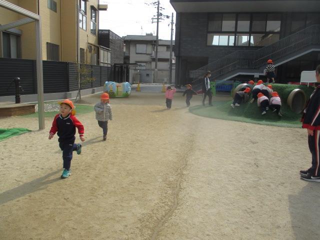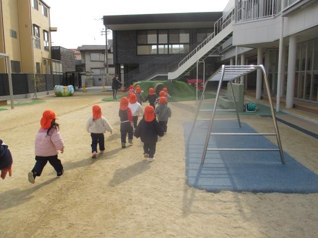 明日は体操服登園で、9時15分に登園してください(9時まで門は閉まっています)ラジオ体操や各クラス設定保育を見て頂いたあと、10時45分頃に終了予定です。