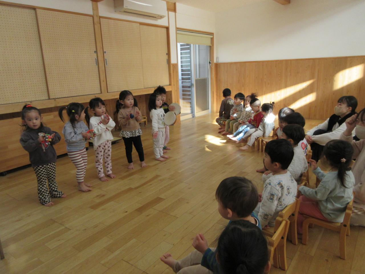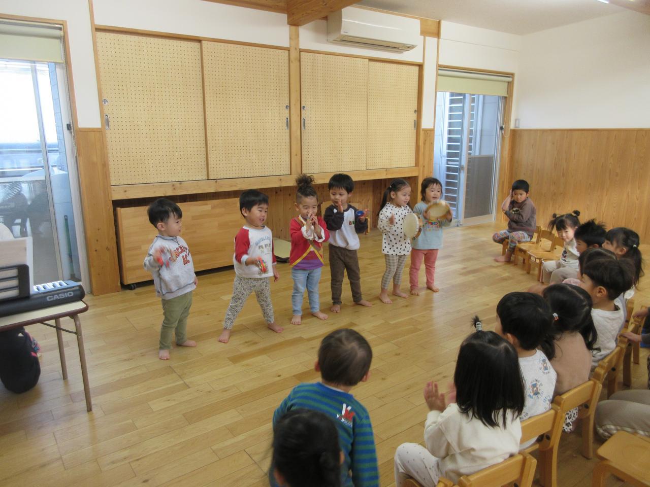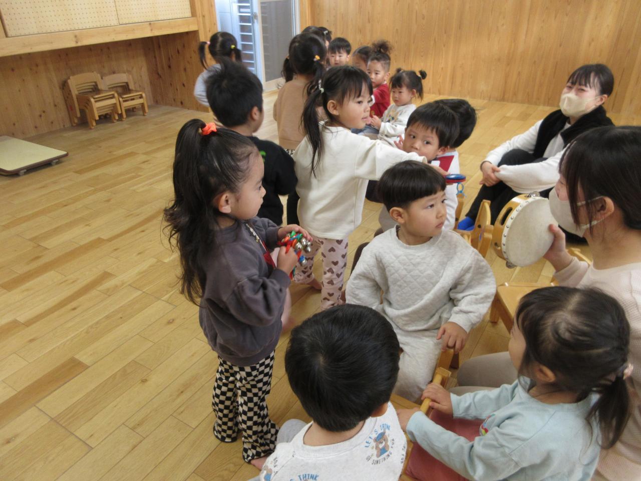 すずやタンバリン、カスタネット…を音楽に合わせて鳴らしています♪