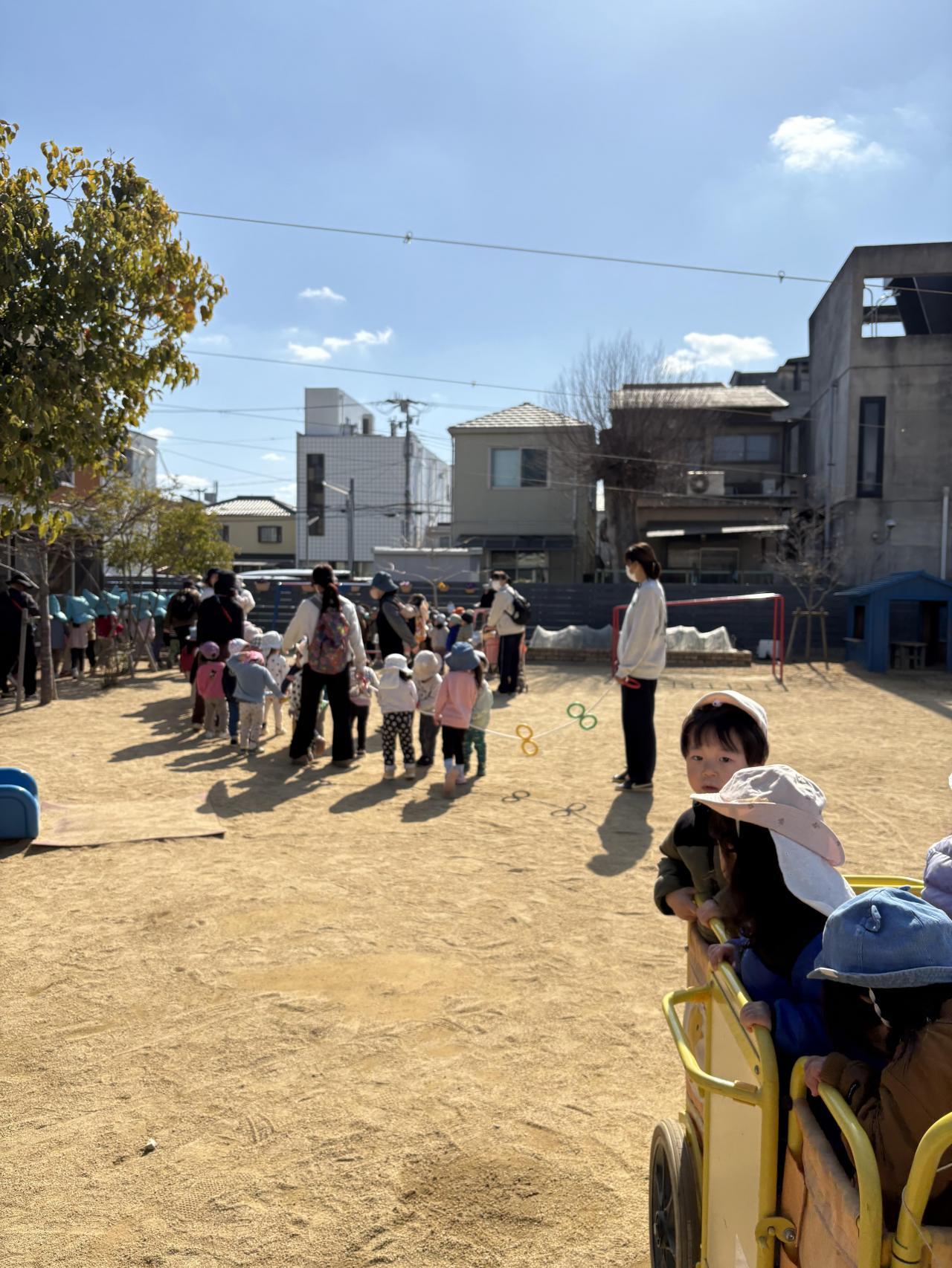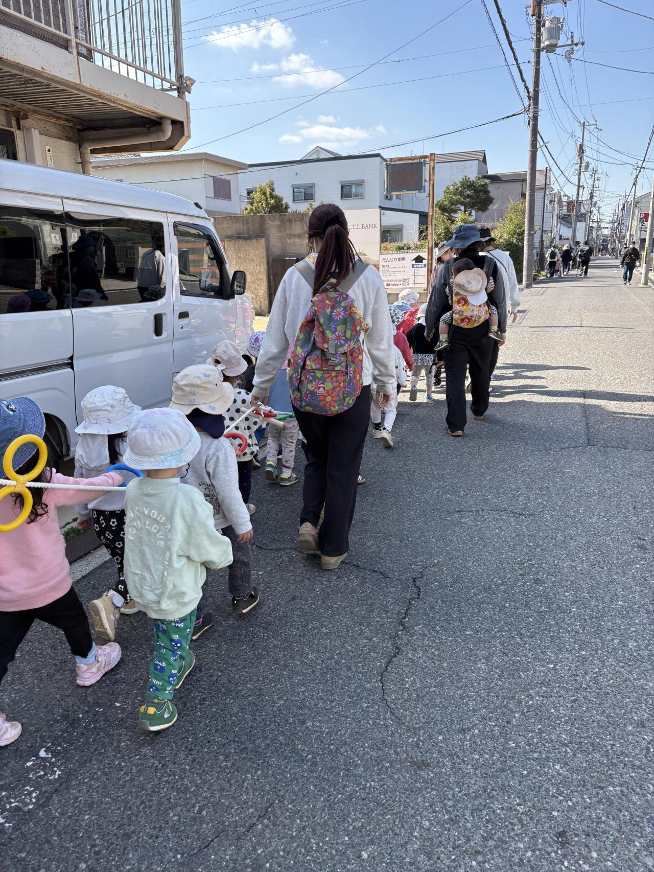避難リングを持って集まって歩いたり、お友達と手を繋いで歩いたり、避難車(バギー)に乗ったり、保育士がおんぶをしたり。。。と、年齢によって様々です。