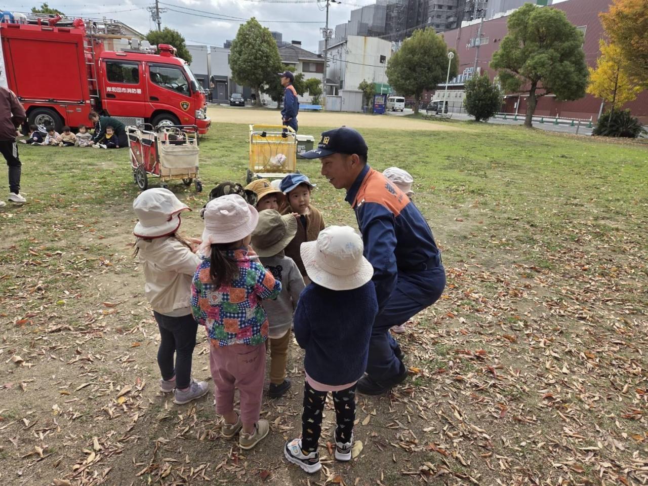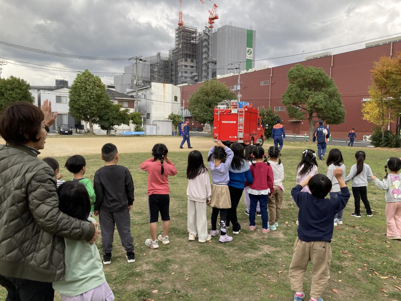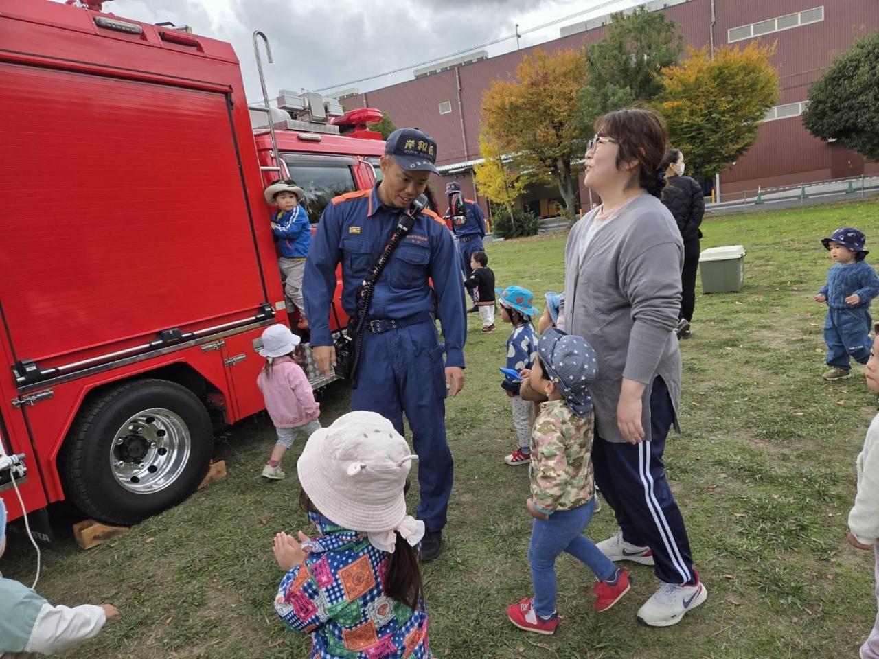 消防士さんたちを見送っています。