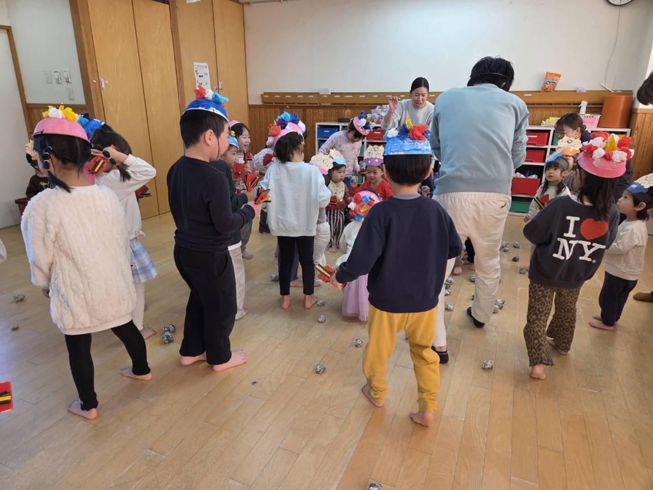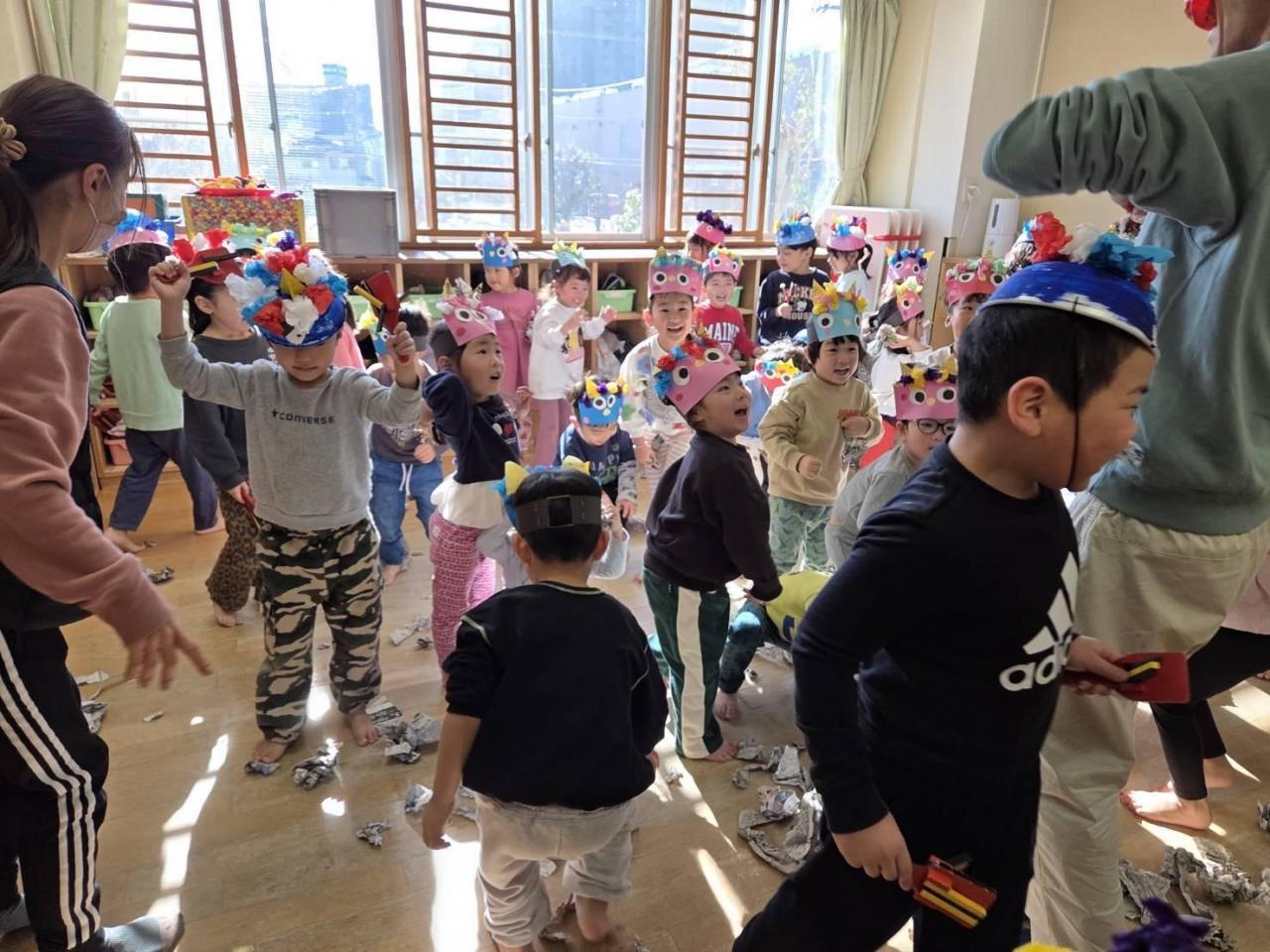 公園で豆まきをしています。