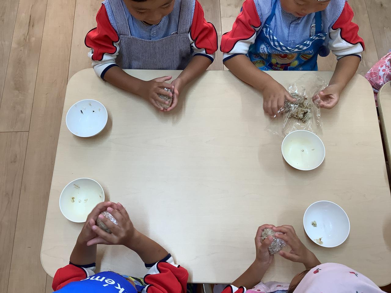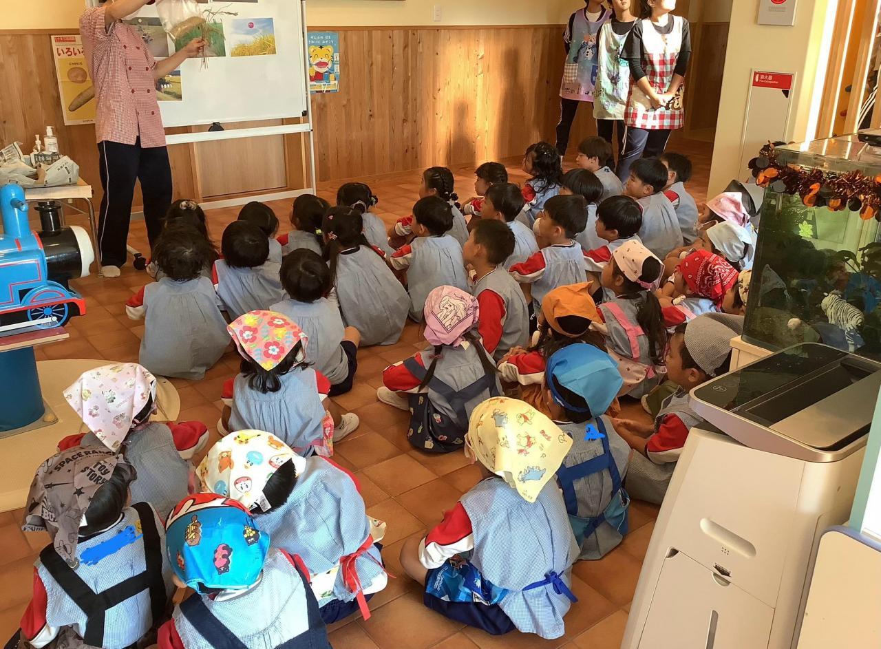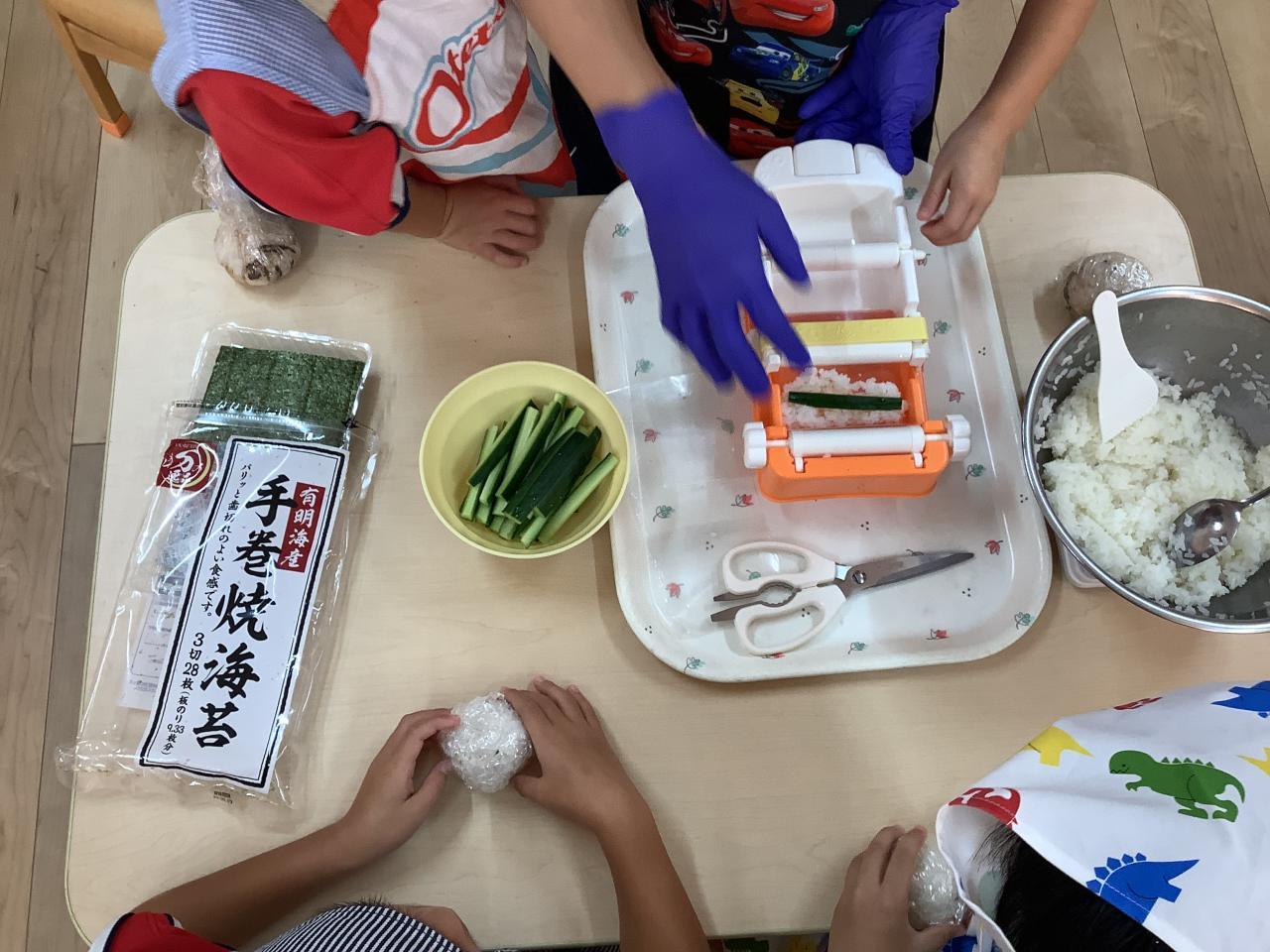 今日は朝から“さゆりん×→魔女りん〇のお話会”があり、午後からはうめ・ゆりぐみが食育会に参加しお米について学んだあと、各クラスでおにぎり&手巻き寿司作りに挑戦しました。