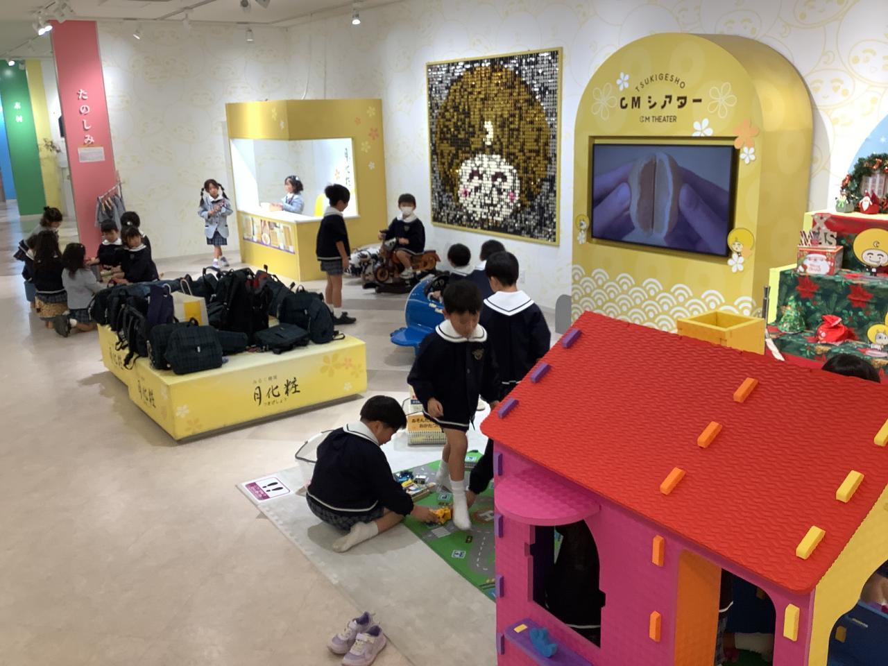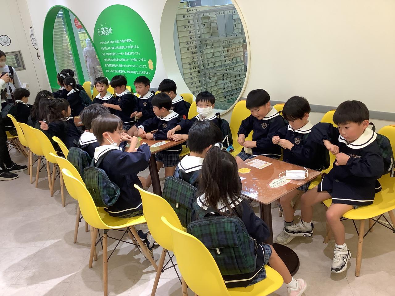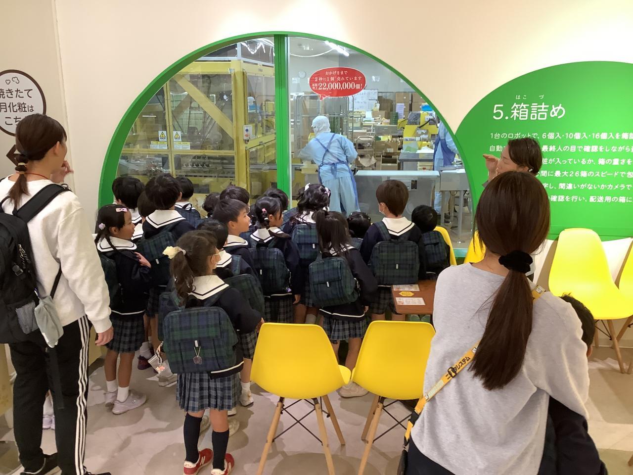ゆりぐみは久々に全員が出席し、揃って楽しみにしていた工場見学に行く事が出来ました。何と言っても見学した人しか味わえない作りたての月化粧の試食、同じく見学した人しか買えない出来立てホカホカの月化粧販売コーナー、子どもたちが見て学べる映像&プレイコーナーという充実ぶり。