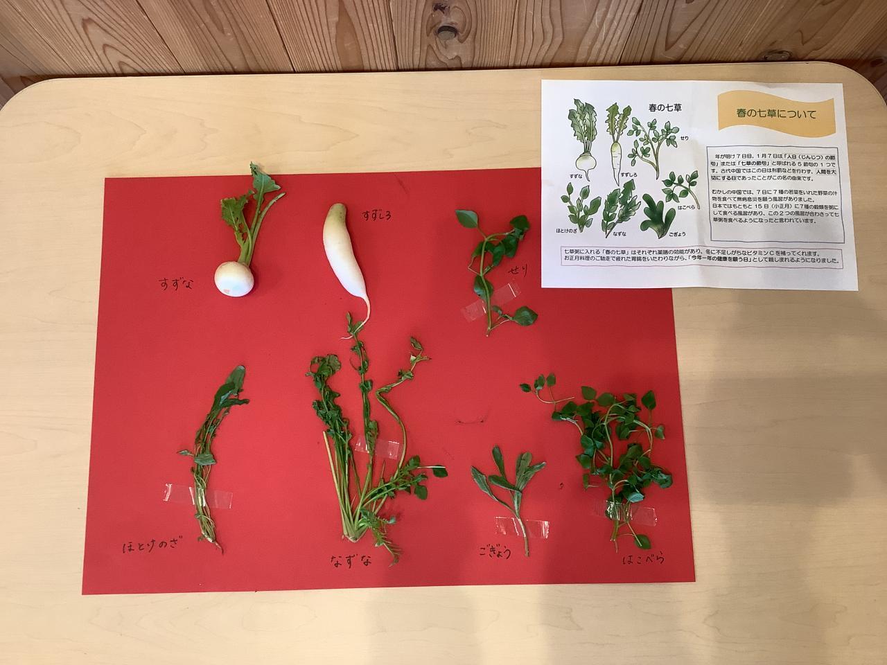 そんな今日は七草の日。正月飾りを片付けてくれた入れ替わりで七草を展示するものの、以前の様に給食で七草粥が出ることはなくなりました。その代わりに(?)栄養士の先生たちは“白菜の中華スープ”という野菜たっぷりの汁物を提供してくれたのでしょう。