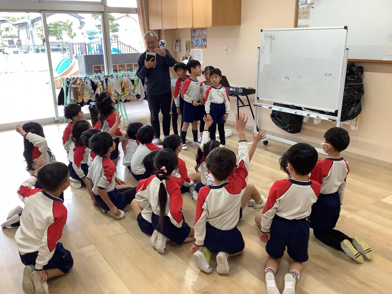 うめ・ゆりぐみはモップさんの造形教室がありました。先ずはモップさんがホワイトボードにペンを走らせ、色んな絵を描き切る前に子どもたちが当てるクイズ。さすがはプロの画力!途中で何かの動物に見えても実はこう、みたいな構成。