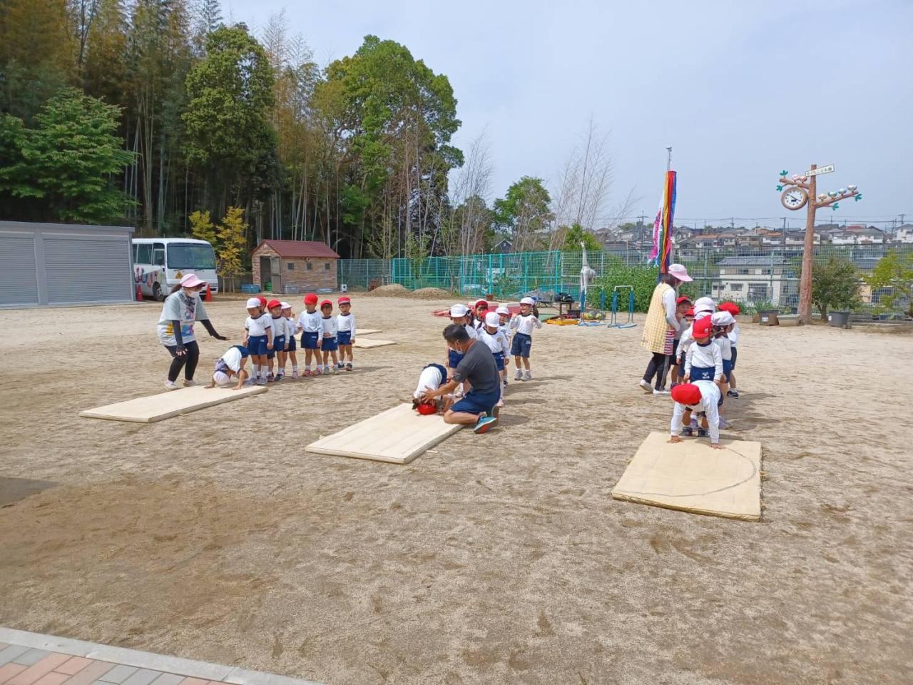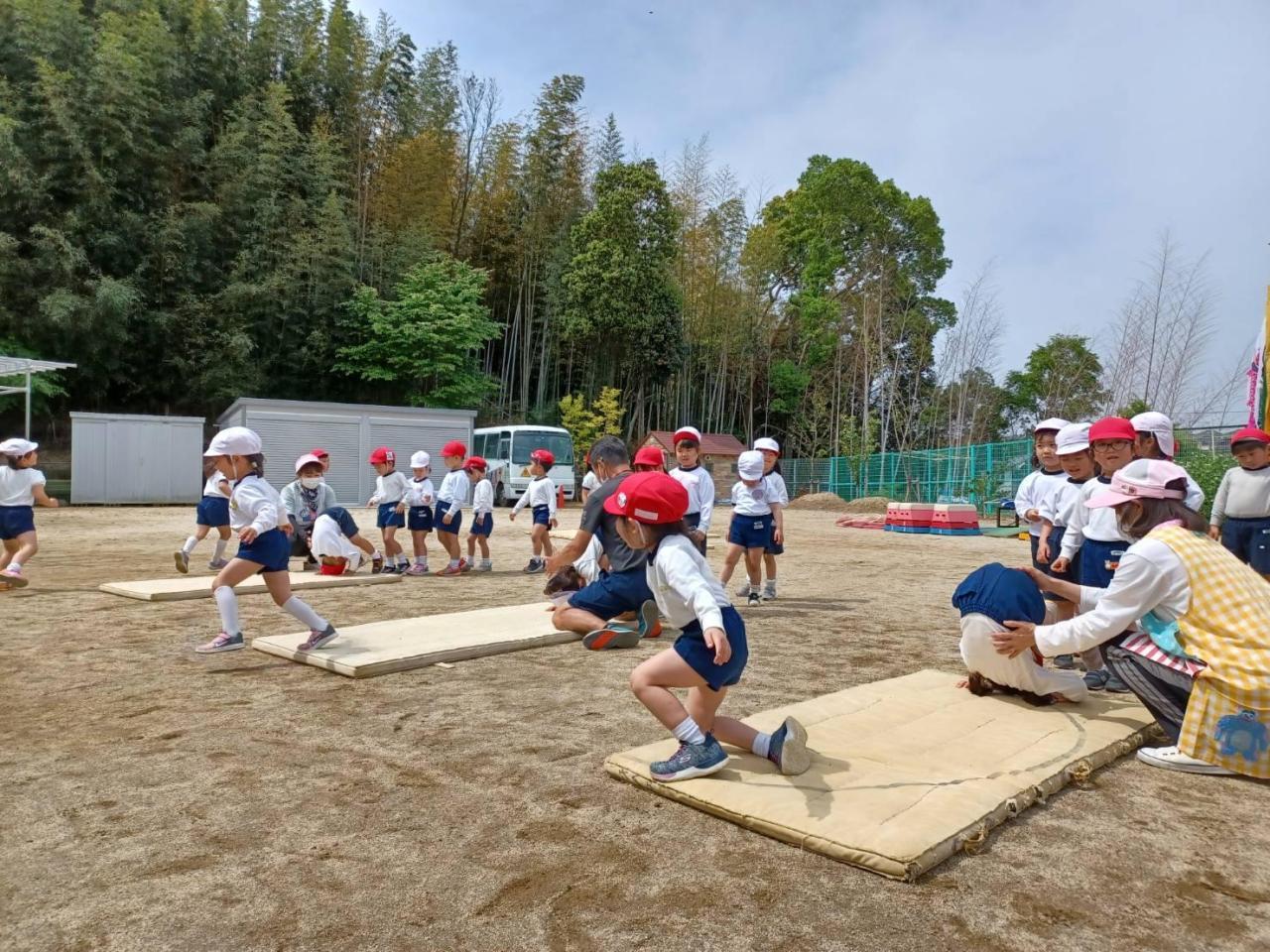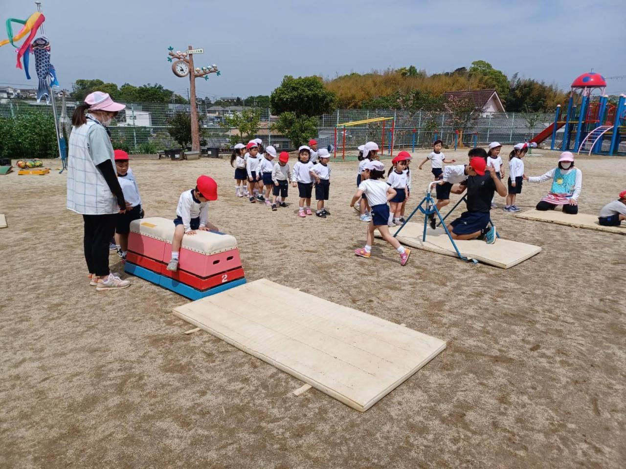 でんぐり返り、鉄棒で前回り、跳び箱で手の力で身体をすすめる練習。