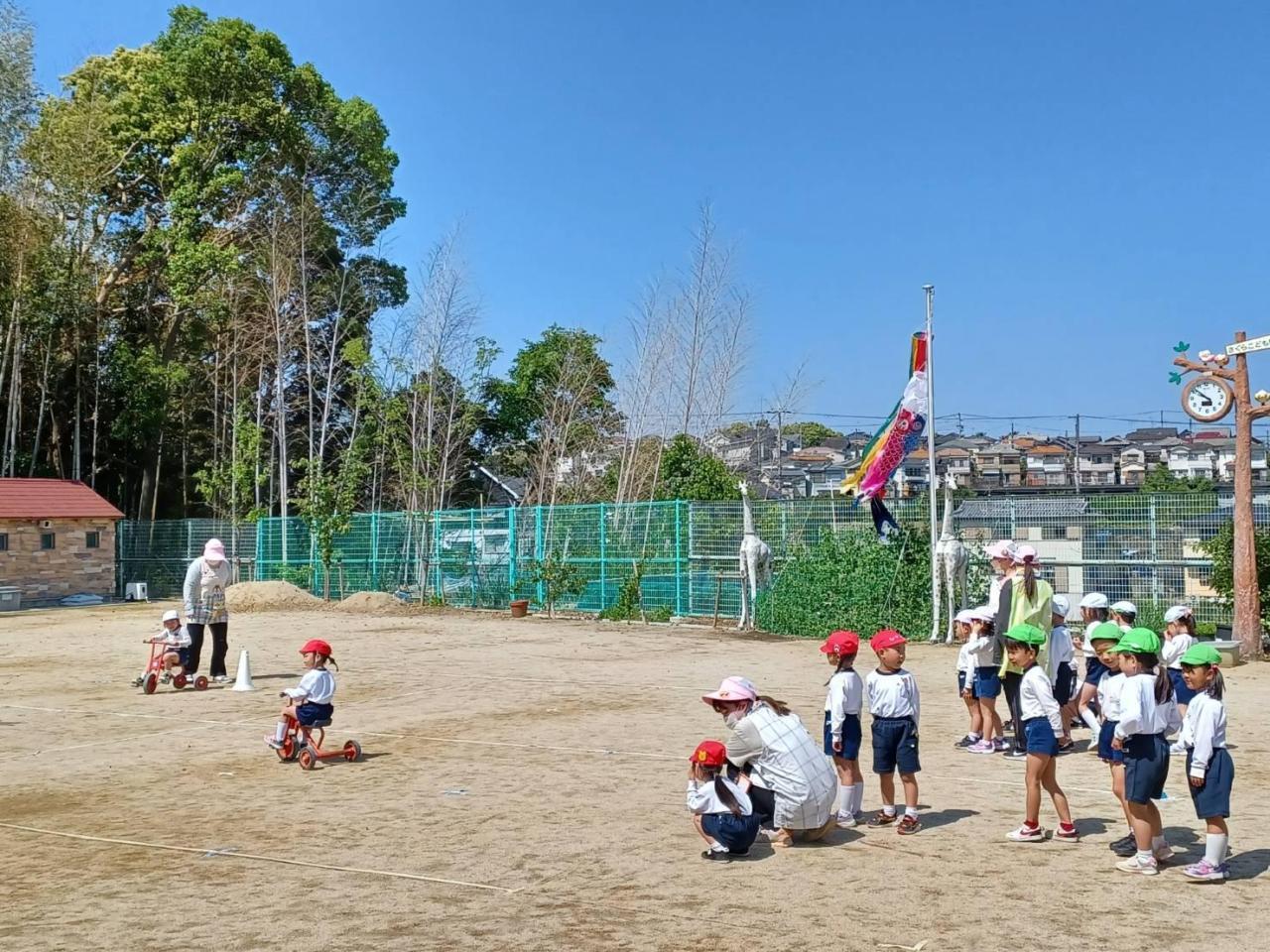 お次はすみれ組&ひまわり組さんです。力一杯三輪車をこぎます。
