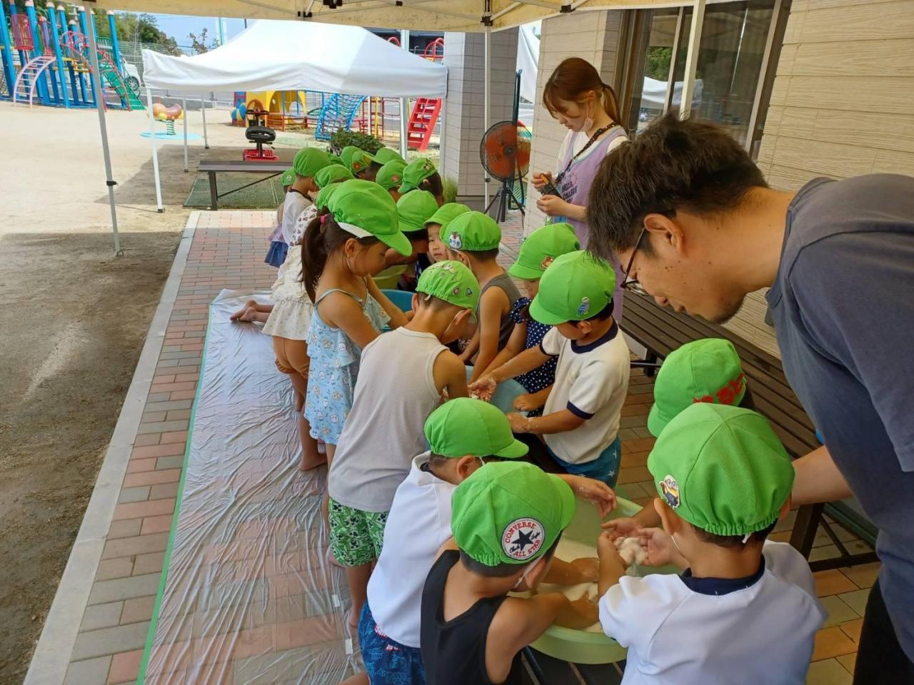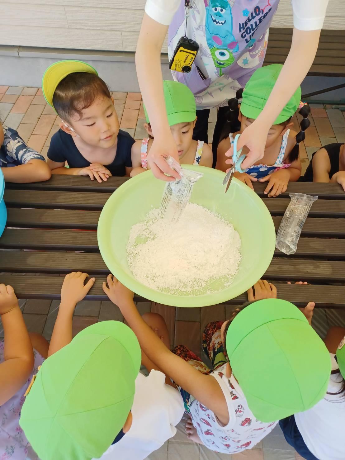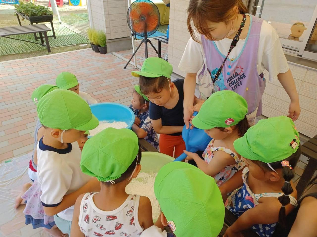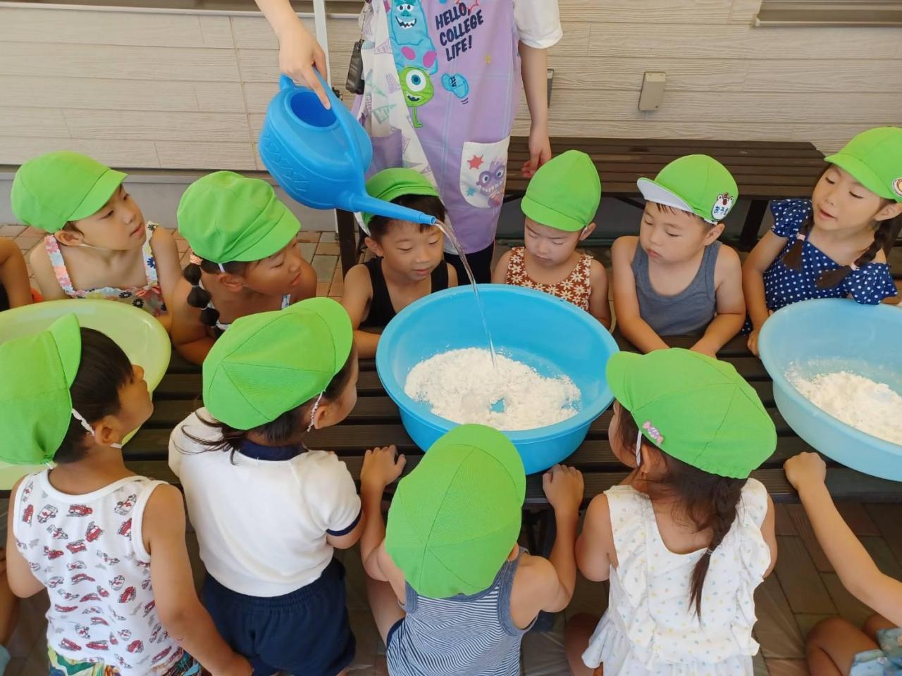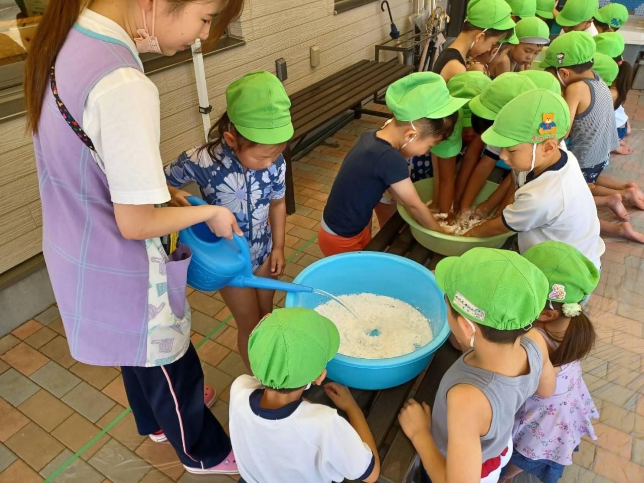 興味津々!!「まださらさら~」「もうちょっと水いれる!」と催促する子どもたち。