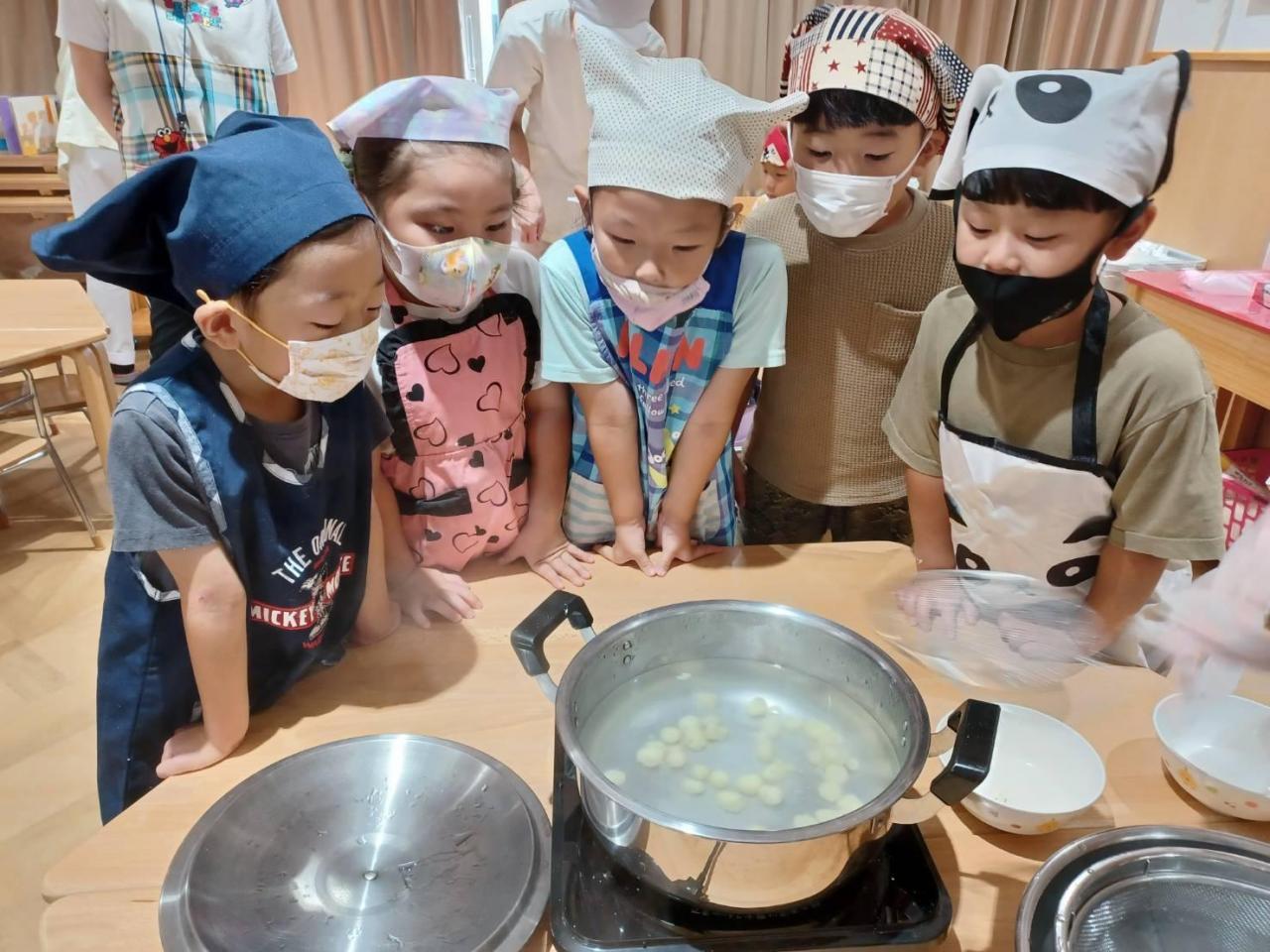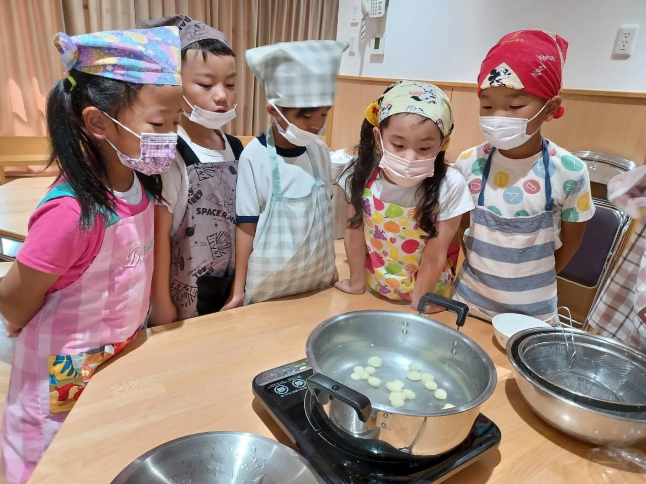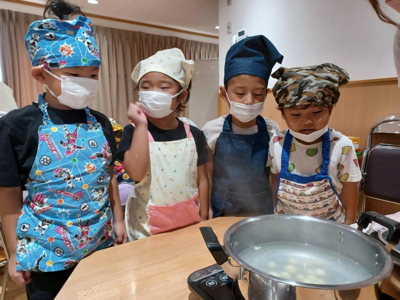 お団子に火が通るとぷかりと浮いてくるのが面白くて、みんな興味津々で見ています。