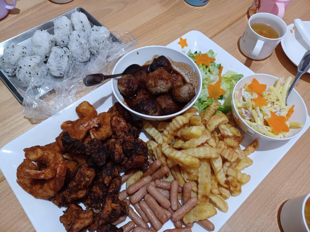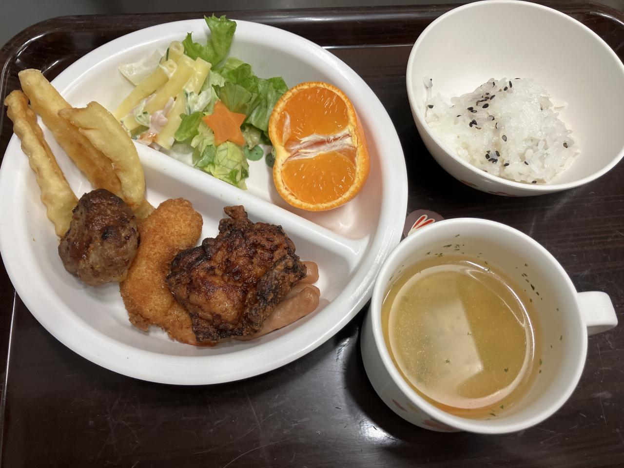 ごま塩おにぎり、唐揚げ、ハンバーグ、エビフライ、ポテト、ウインナー、サラダ、マカロニサラダ!