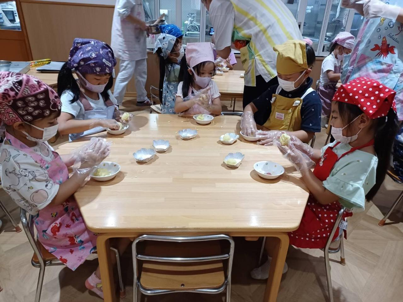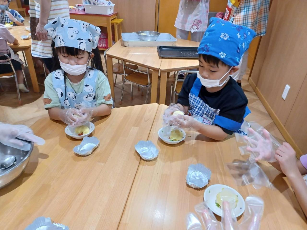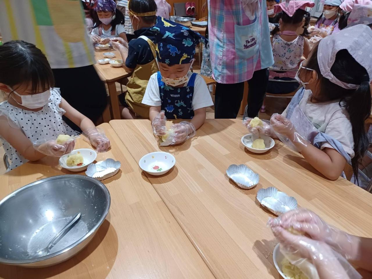 みんな思い思いの形のスイートポテトが出来ました。オーブンに入れて焼いてもらいます。
