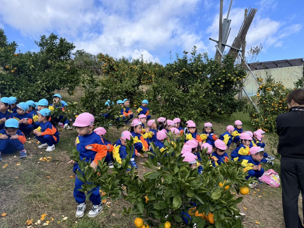 こどもたちはそれぞれ木からおいしそうなみかんを探していました。「先生、これ甘いかな?」「こっちとどっちが良い?」と