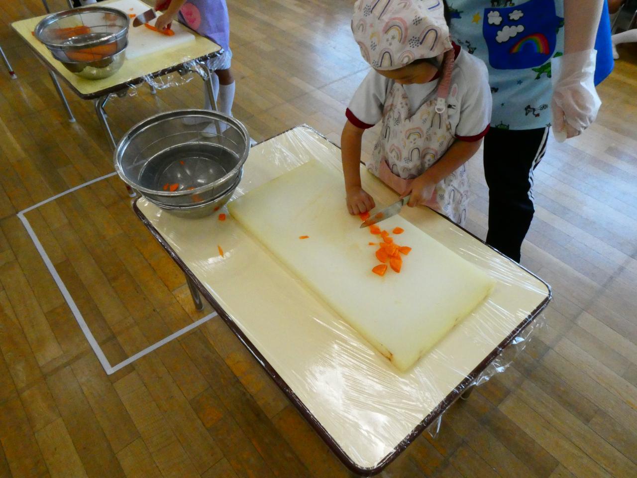 野菜の皮むきをして、包丁で切って、炒めて、ルーを入れて、みんなで大鍋でカレーを作りました!