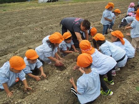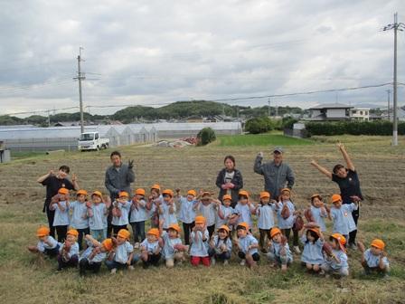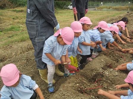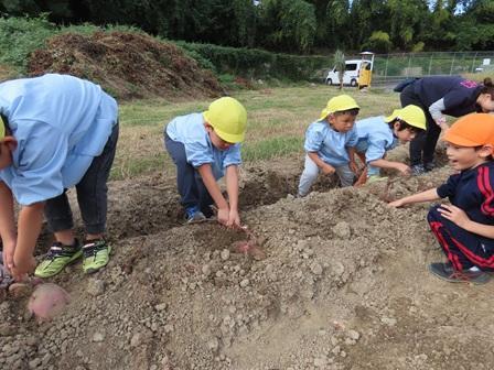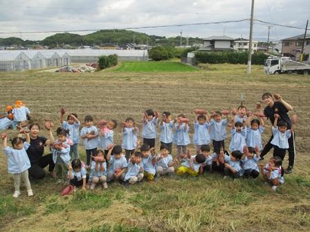 今日は園のお隣にあるJAいずみの営農センターさんからのお誘いで、幼児クラスがさつまいも掘り体験に出掛けました。収穫体験へのお誘いは今年で10年目となり、今年も固い土や土中の虫さんやカエルなどと格闘しながら、大きなお芋をたくさん掘らせて頂きました。今日は朝から良いお天気に恵まれ絶好の芋掘り日和。まずはすみれ組さんから「いってきまーす!」と出発し、遅れてゆり組さんも出発。それからしばらくして認定こども園五風会の年長さんがバスで到着し、今年ももも組さんと一緒に仲良く手をつないで出発しました。今年掘らせていただいたのは「紅はるか」という品種で、今年は土の表面が乾燥しなかなか掘りにくそうにしていましたが、JAの皆さんのお手伝いにより大量のお芋を掘り上げることが出来ました。今日は幼児クラスにお芋を持ち帰ってもらっていますので、表面が乾くまで干してから美味しく頂いて下さいね。また一部は今後の給食にも使用させていただく予定ですので、全園児で美味しくいただきたいと思います。