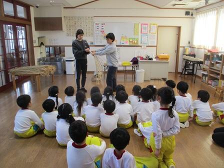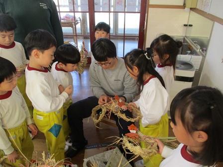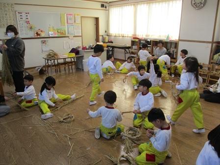 そして午後からもも組さんは、卒園児のお母さんによる指導でしめ縄づくりに挑戦しました。10月に刈り取った稲わらを頂き、長い期間屋外で干していましたが相当数のお米をスズメに食べられ、今年はみんなにしめ縄が当たるかなと心配していましたが大丈夫でした。初めて編んでいく稲わらはこども達にとって固かったと思いますが、女の子を中心に三つ編みが得意な子はどんどん進んでいき、お友達のお手伝いもあり無事に稲わら編みは終了。最後に飾り付けを行いしめ縄は完成しました。12月も残すところ今日を入れて21日となり、そろそろお正月準備というご家庭もあると思いますが、お正月にはこども達が作ったしめ縄を玄関に飾って下さいね!