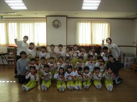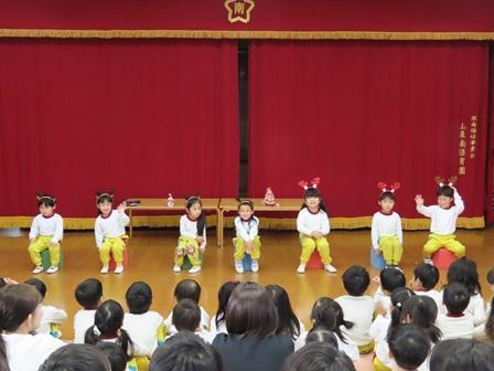 今日は12月度のお誕生日会を開催しました。12月生まれのお友達は全体で7名在籍しており、2階ホールでのお誕生日会では7名全員がみんなからお祝いされました。お誕生児紹介の後、今月は紙コップを使ったゲームを楽しみました。これは紙コップを両手に入れモフモフをつかむゲームで、コツをつかんだ子はすいすいと得点を重ねていきましたが、応援するこども達は何とも不思議そうな顔で応援していました。ゲームの後は先生たちによる寸劇「サンタクロースの12ヶ月」を楽しみお誕生日会は終了しました。12月生まれのお友達お誕生日おめでとう!