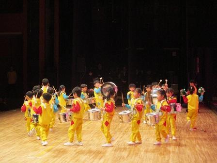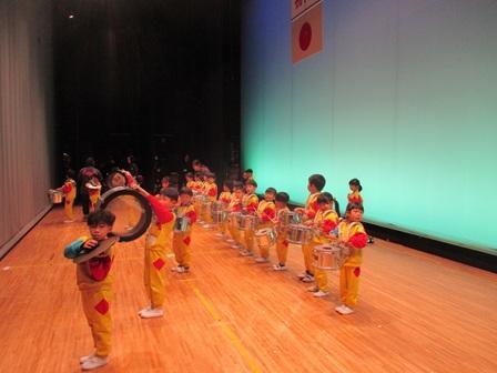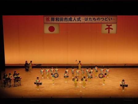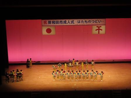 岸和田市の式典は午前と午後の二部に分かれており、もも組さんは午前に開催された山手側6中学校区の式典に参加しました。市長や来賓のお祝いの言葉がある式典が終わりいよいよもも組さんの出番!という時に「お腹痛くなってきた・・・」という子もいたようですが、幕が開くと少しスローな展開から徐々に調子に乗っていき、ファーメーションも含め2曲をしっかり演奏し会場から大きな拍手を頂きました!