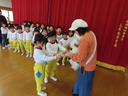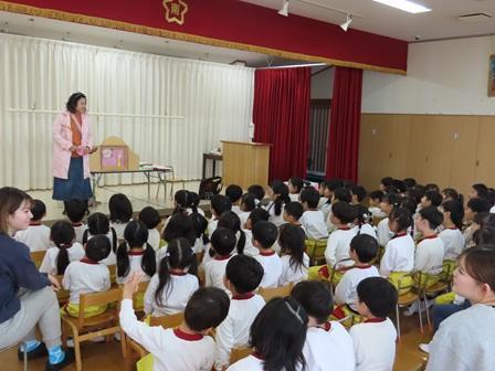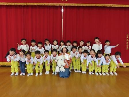 今日の様子です。今日は朝からさゆりんお話し会、午後からもも組・ゆり組さんの英語指導と地震を想定した防災訓練を行いました。どれも今年度最後ということで、もも組さんにとっては園生活最後の回となります。さゆりんお話しでは、今まで多い子で50回、60回と参加している子もおり、涙こそありませんでしたが最後にお手製のプレゼントを渡し、感謝の気持ちを伝えていました。乳児期から絵本に接することはとても大事なことで、創造力や読解力などこれから始まる小学校生活での国語にも力となってくれます。さゆりんの思いも胸に小学校でもがんばってくださいね。