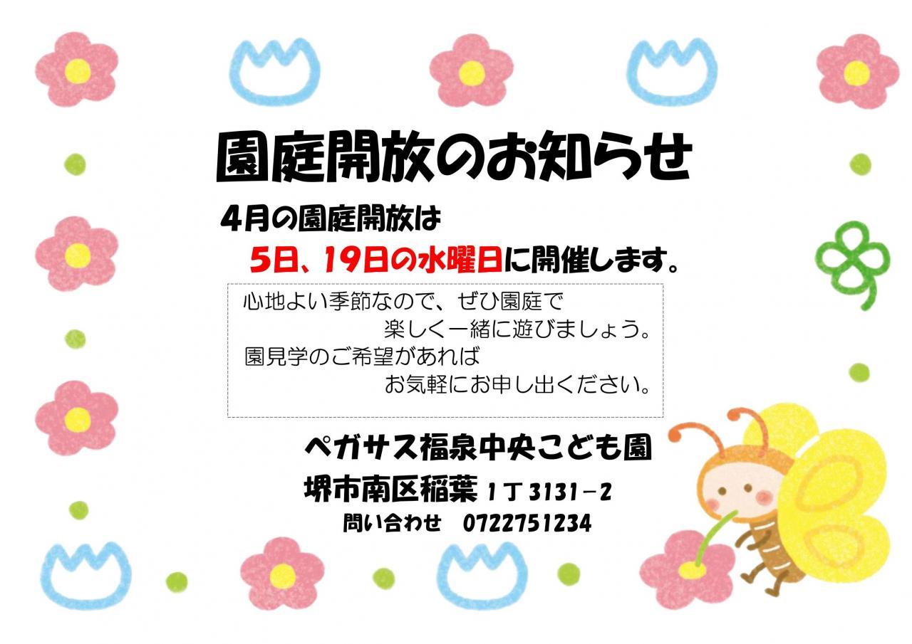 ペガサス福泉中央こども園では、毎月第一・第三水曜日の10時~11時に園庭を開放します。