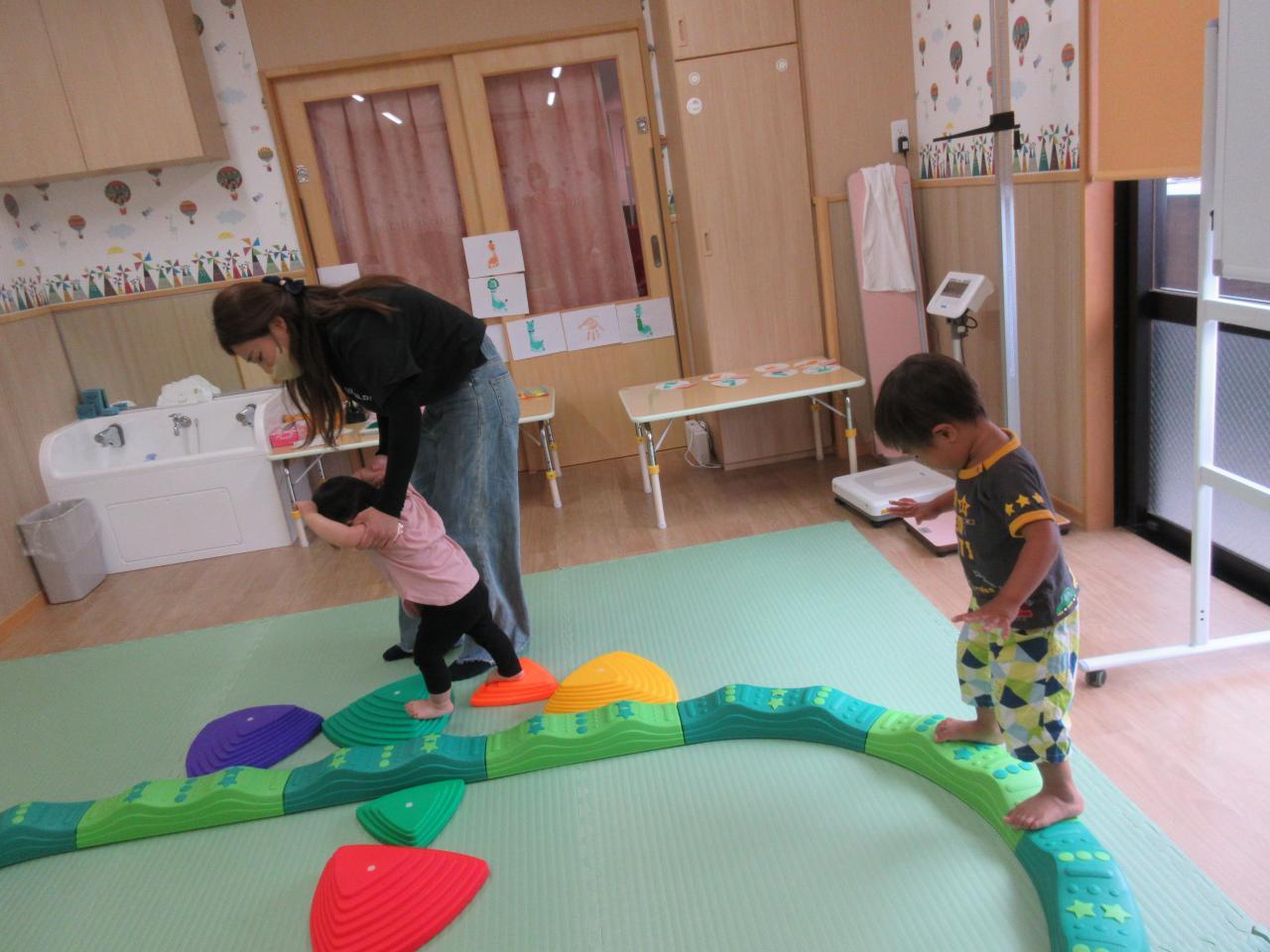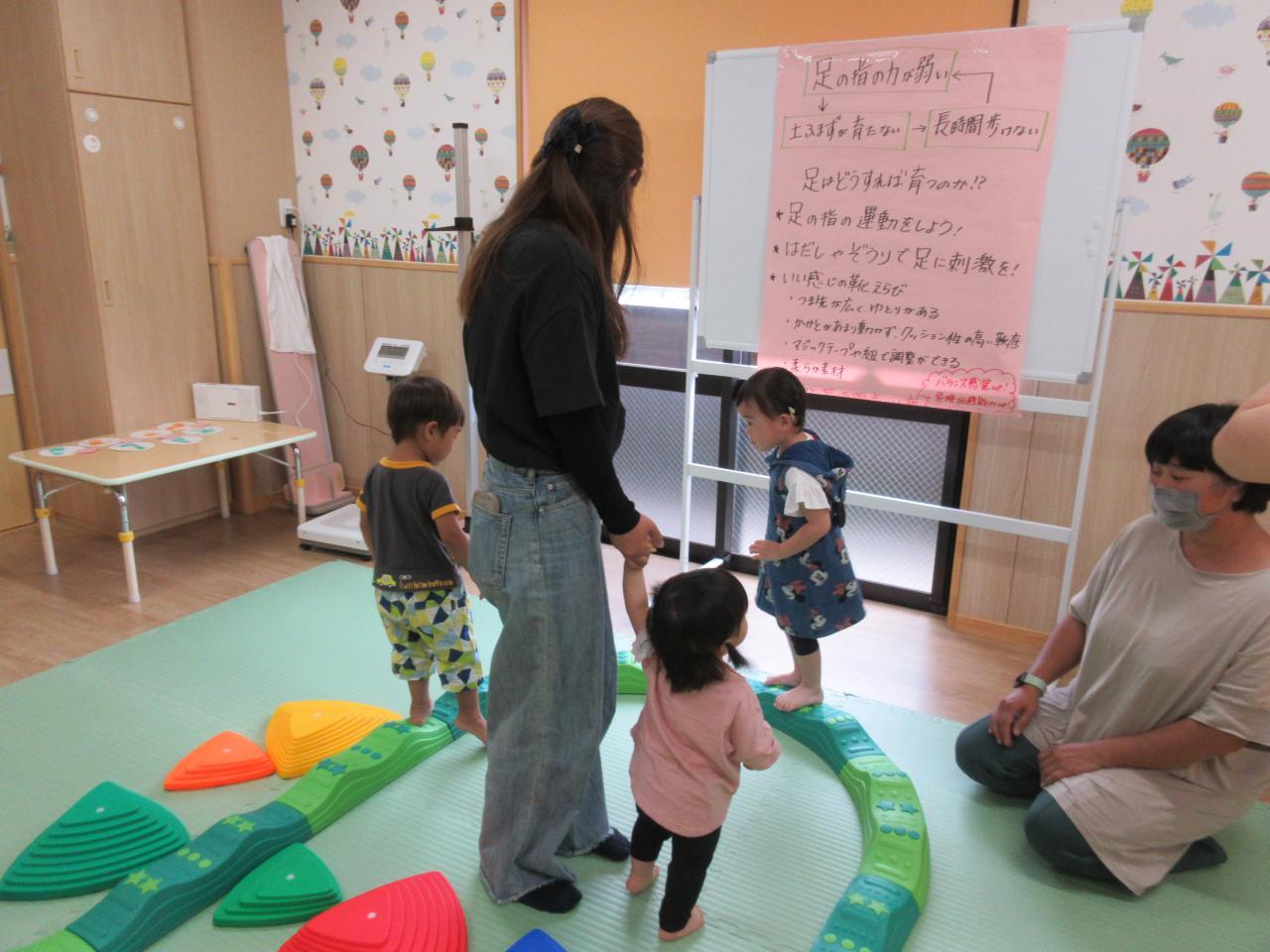 その後、ミニサーキットで飛び石渡りやバランスボードの平均台など、足を使う遊びをしました。バランスボードの平均台や飛び石渡りでは、親子で手を繋いで渡ったり、お子さまの歩く後を保護者の方が「まてまて~!」と追いかけたりして楽しんでいました!