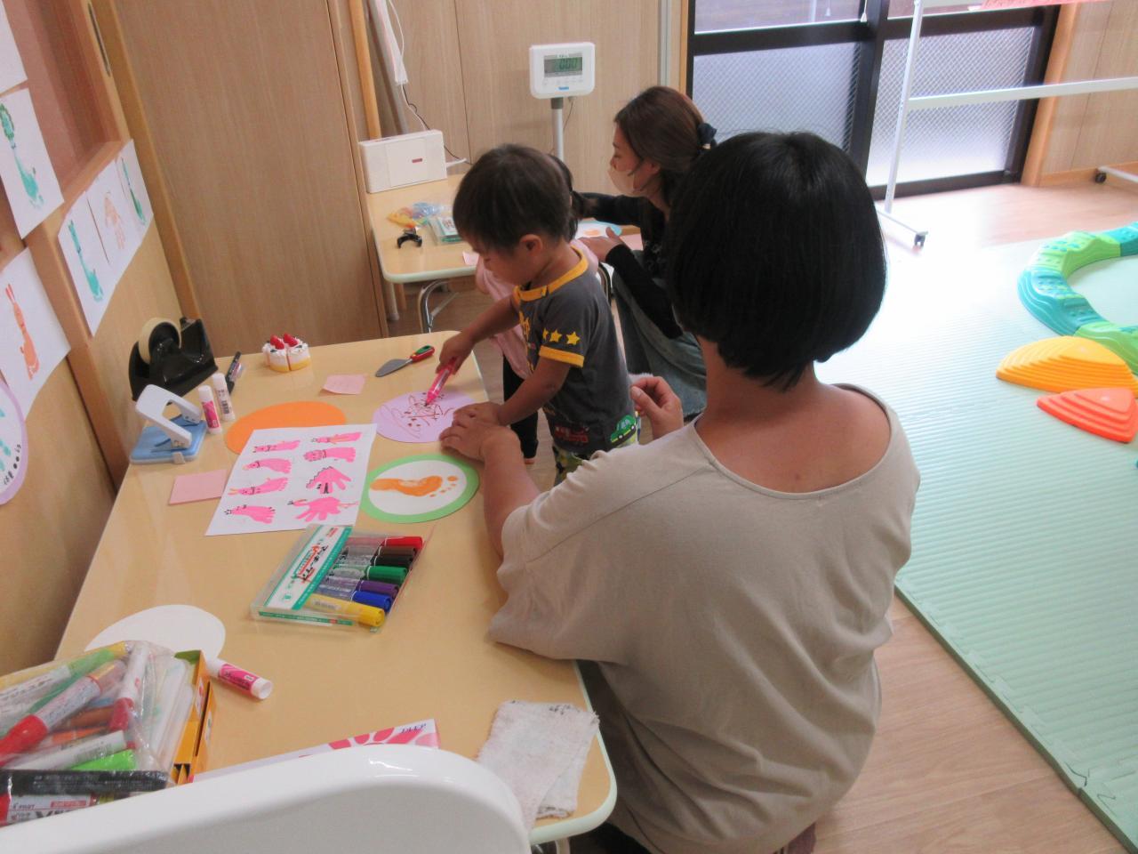 ミニサーキットで身体を動かした後は『手形・足形アート』を作りました。手形・足形のスタンプをとった後、ペンギンやキリン、フラミンゴなど、好きな動物を選び親子でお絵描きをしました。とても可愛い作品になりましたよ。