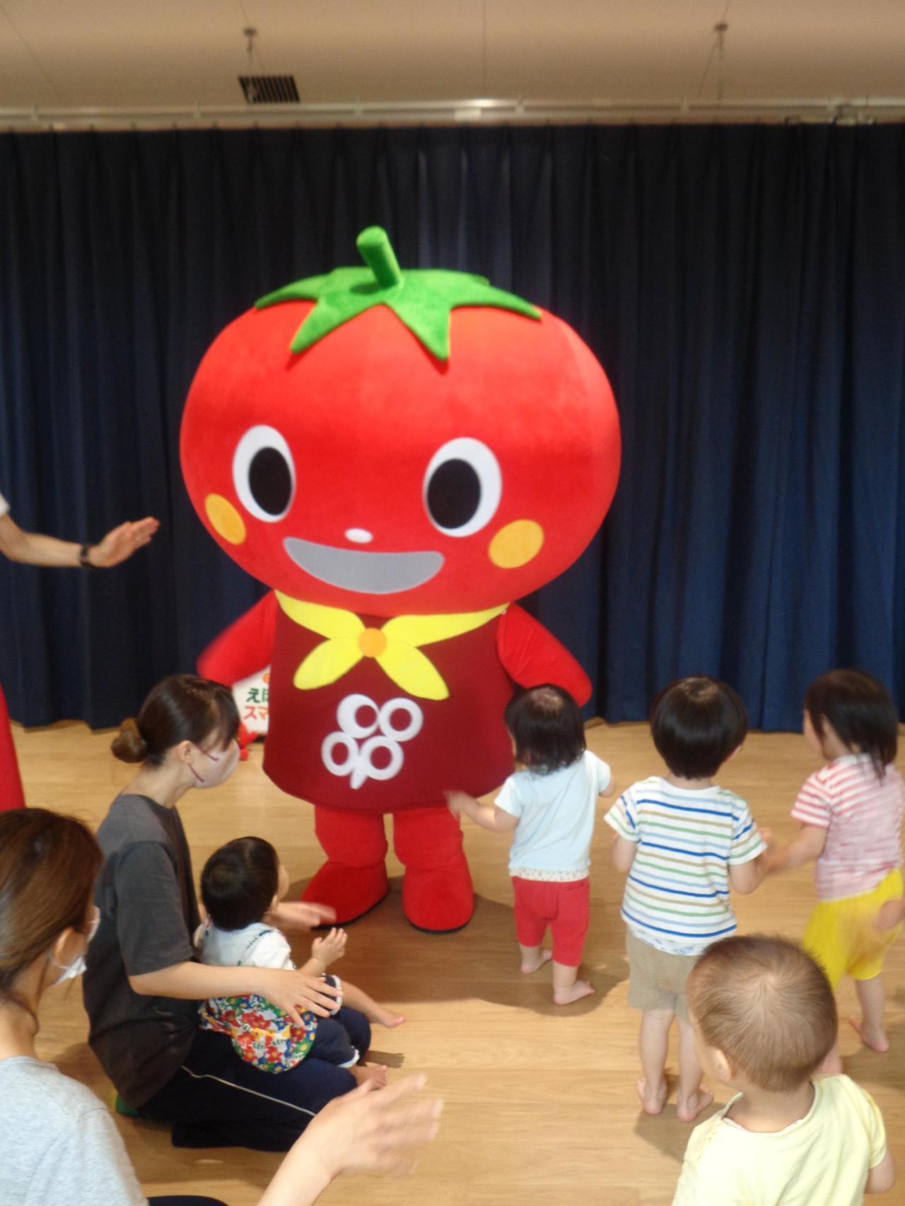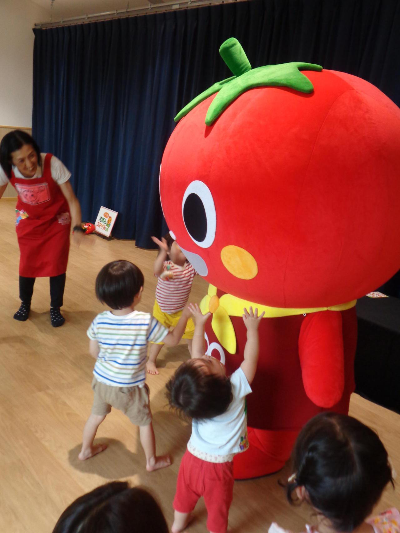 絵本を楽しんだ後は、トマトちゃんが遊びに来てくれました!トマトちゃんが登場すると大喜びの子ども達!トマトちゃんに抱きついてみたり、握手してもらい大興奮の様子でした。『トマトちゃんとまねっこ遊び』では、一緒にジャンプしてみたり、くるくる回ってみたり、トマトちゃんの動きを見ながらたくさん身体を動かして楽しみましたよ。