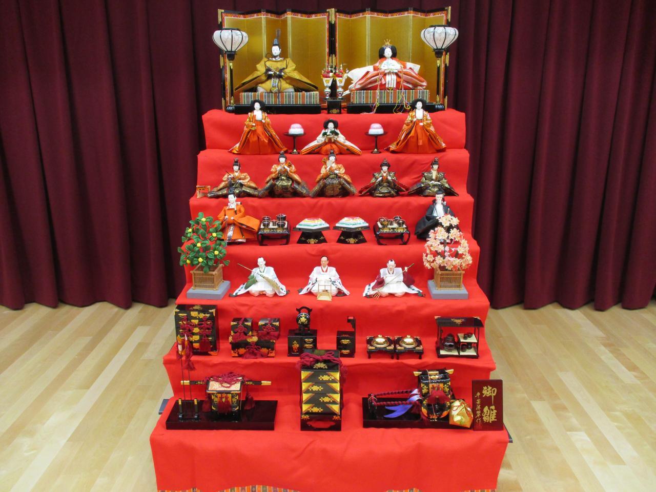 次にお遊戯室の幕を開けてみると……!!立派な7段飾りのおひな様の登場です🎎