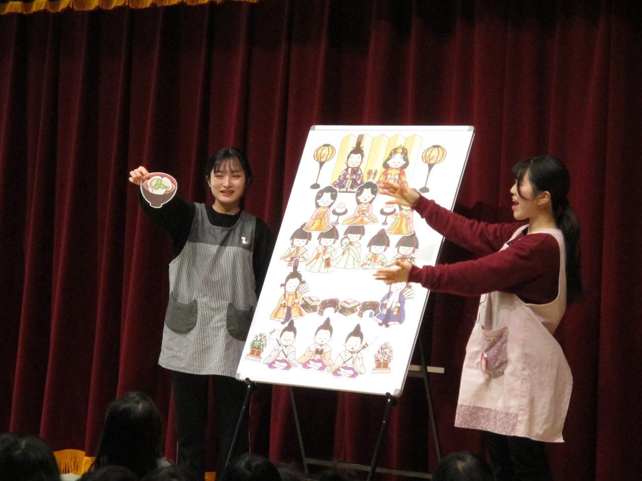 ひな祭りのお祝いで食べるもので、ちらし寿司や白酒、はまぐりのお吸い物やひなあられがあることのお話を聞きました!!