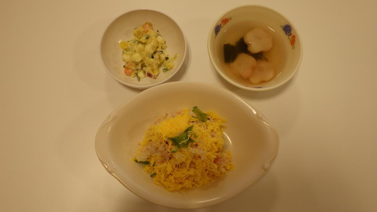 今日の給食は、「ちらし寿司、さつまいもサラダ、すまし汁」でした。