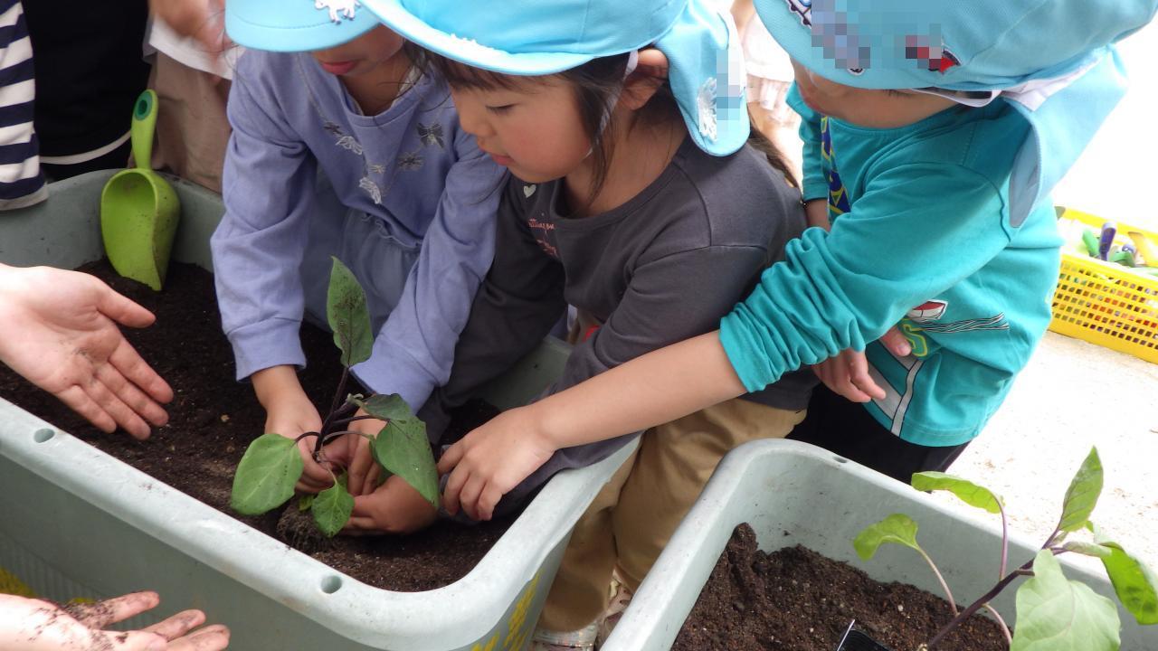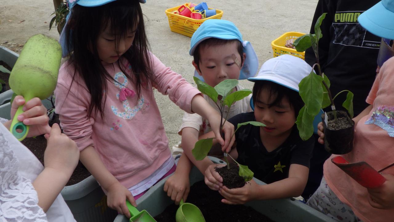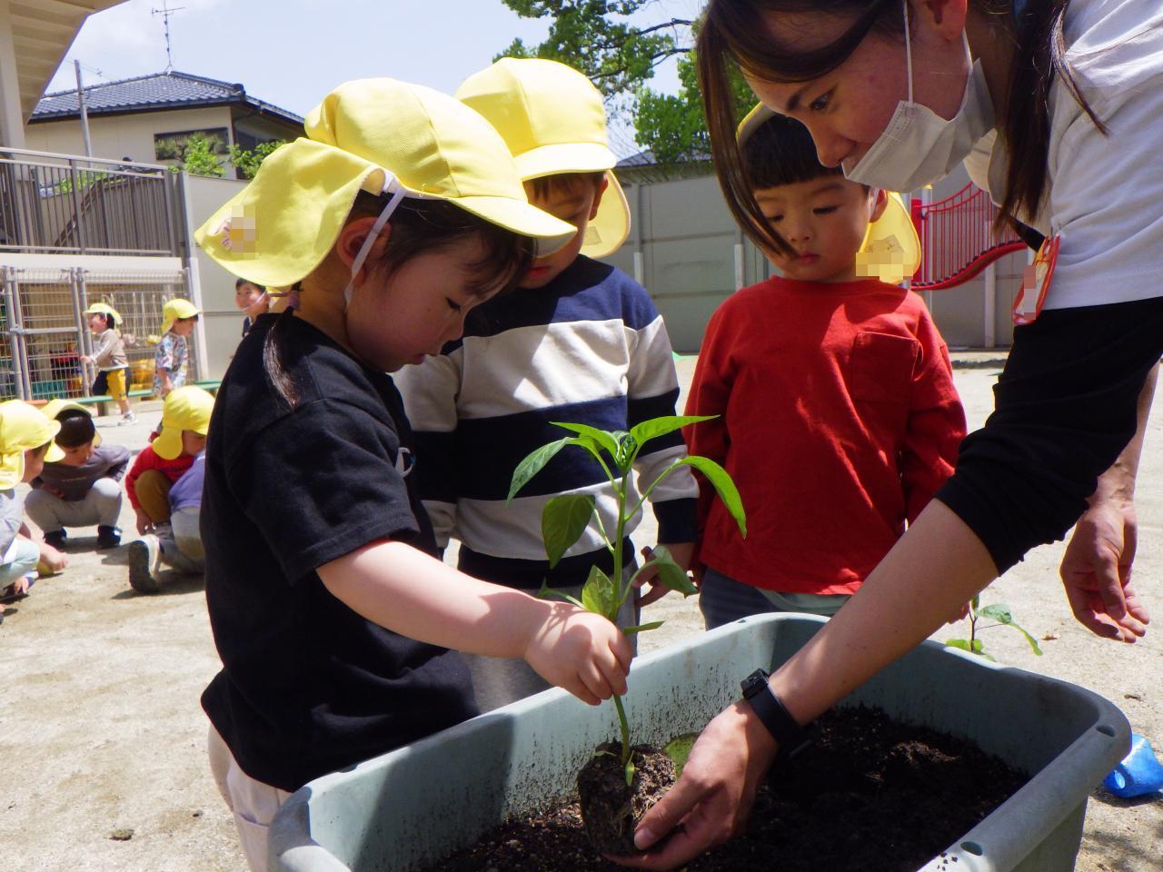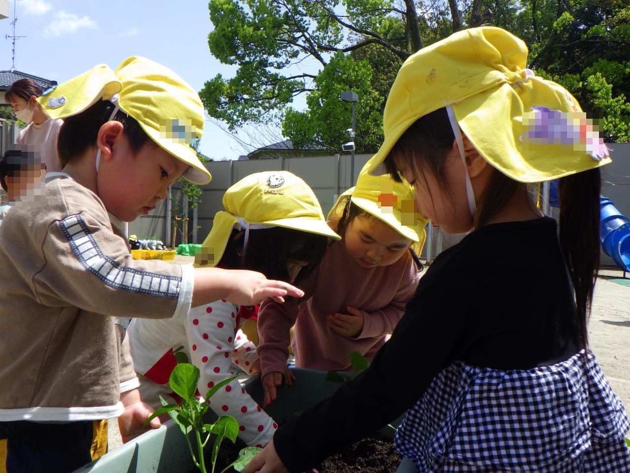 食育の一環として3歳児クラスはピーマン、4歳児クラスはオクラ、5歳児クラスはナスの夏野菜を園庭のプランターに植えました🍆。