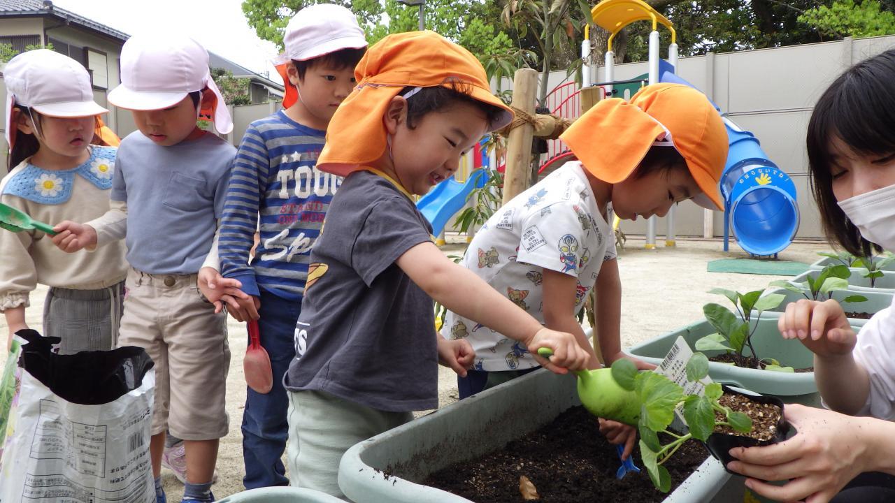 元気に育つように野菜の水やりやお世話がはじまります。大きく育った野菜は自分たちで調理したり、給食の先生に調理していただいて給食で出していただきます😀。