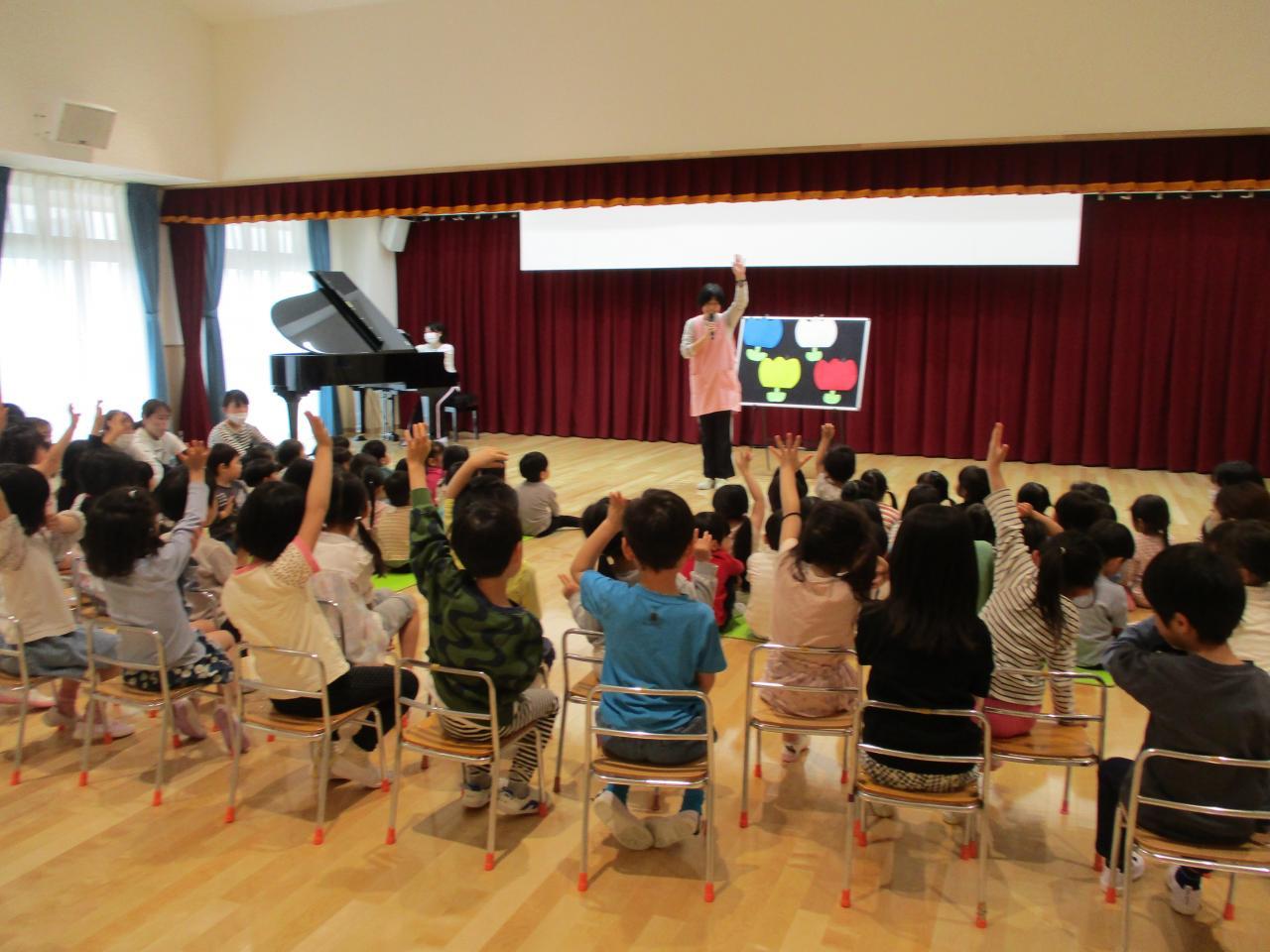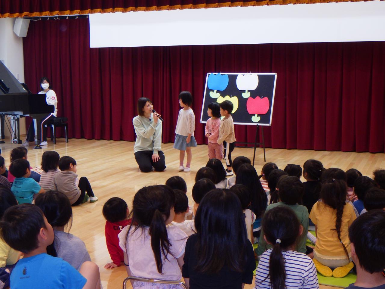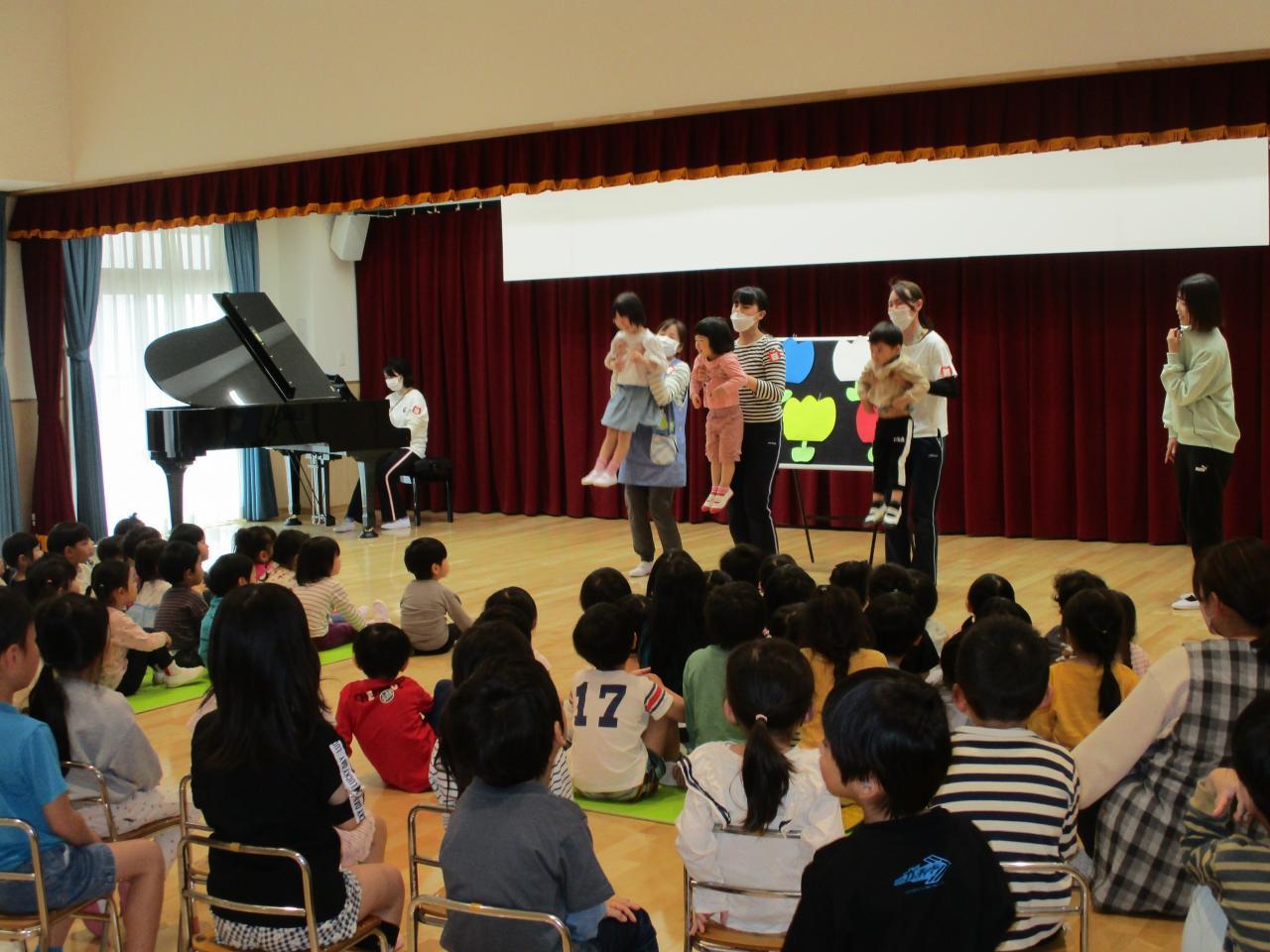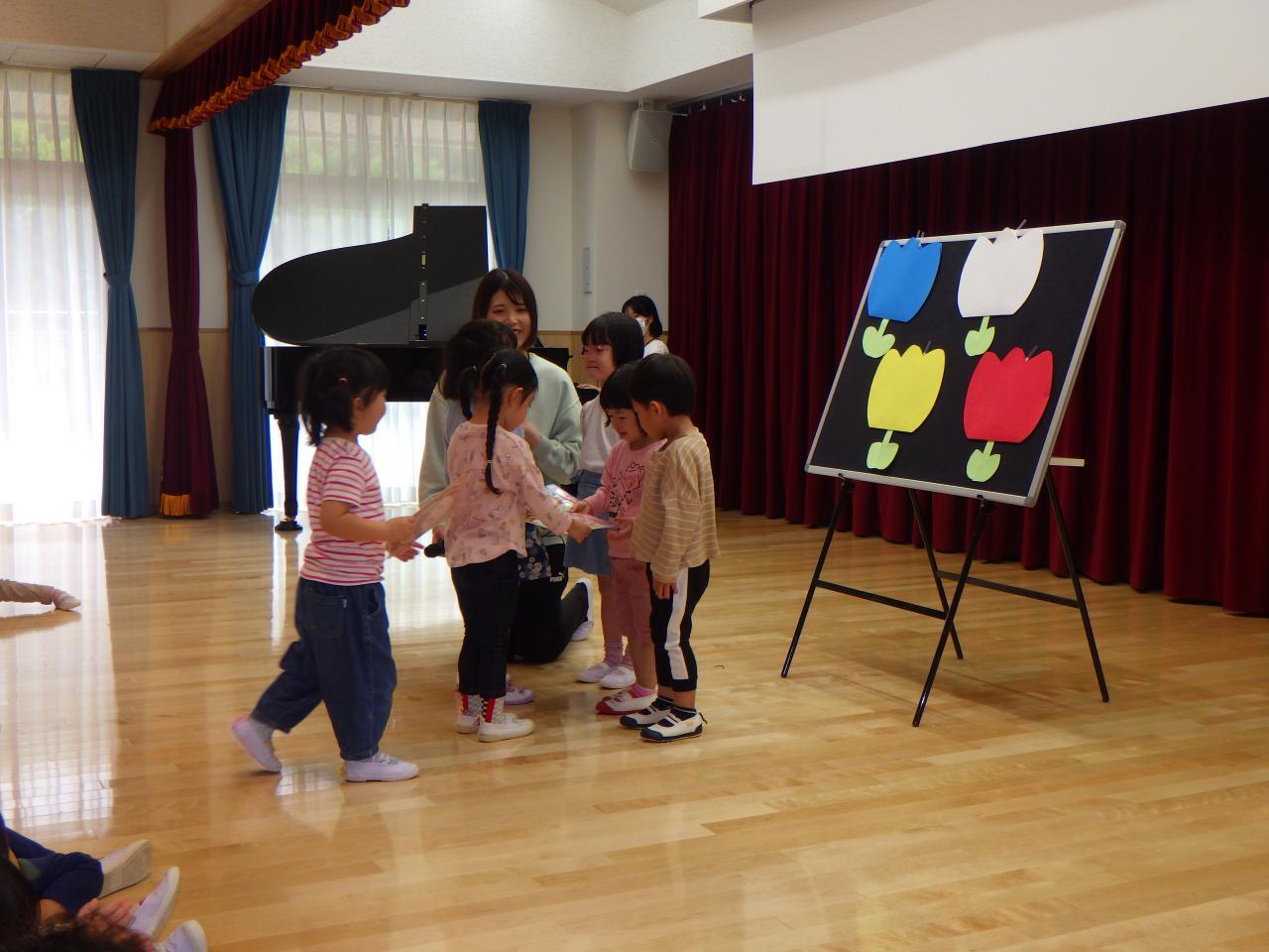 最初に今月のうた「ちゅうりっぷ🌷」を皆でうたい、次に園長先生のお話があり、お祝いの言葉をいただきました。