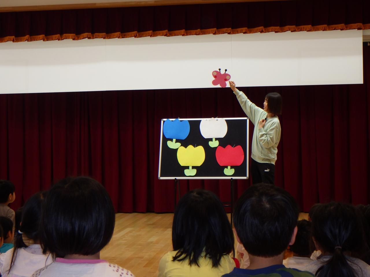 最後に先生からのお楽しみがあり、「へんしんちょうちょう🦋」というお話でした。白いちょうちょうが色々なお花の蜜を吸うと、羽の色がどんどん変わりました。みんな、「次はオレンジ!」「ピンク!」と、自分の好きな色や知っている色々な色を、楽しそうに答えていました。
