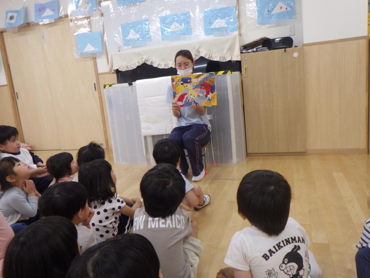 保育室では「やくそくしようよ、とびだしきんし!」の紙芝居を見ました。