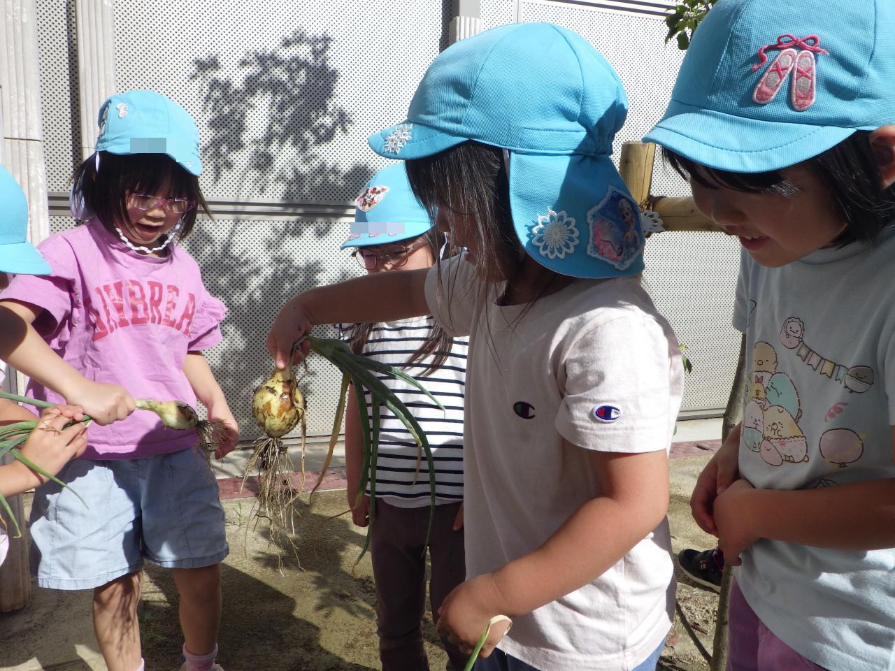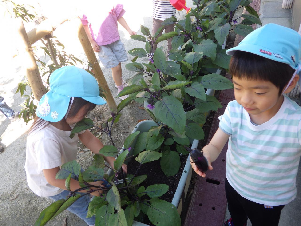 5歳児クラスは、なすび🍆とたまねぎを収穫しました。子どもたちは、「ヒゲみたいな根っこがある」「なすび、ピカピカしてつるつるしてる」と、大喜びでした。