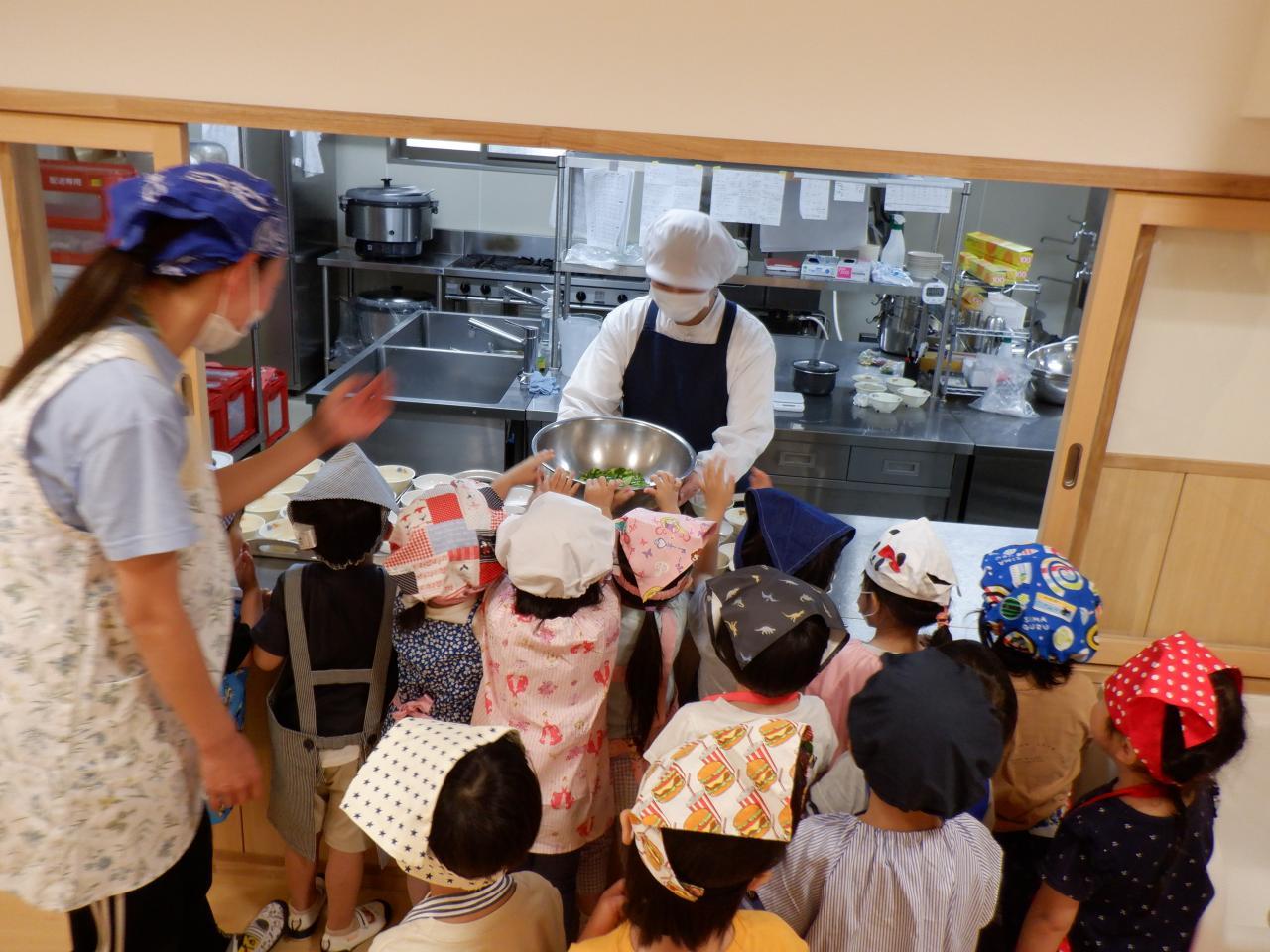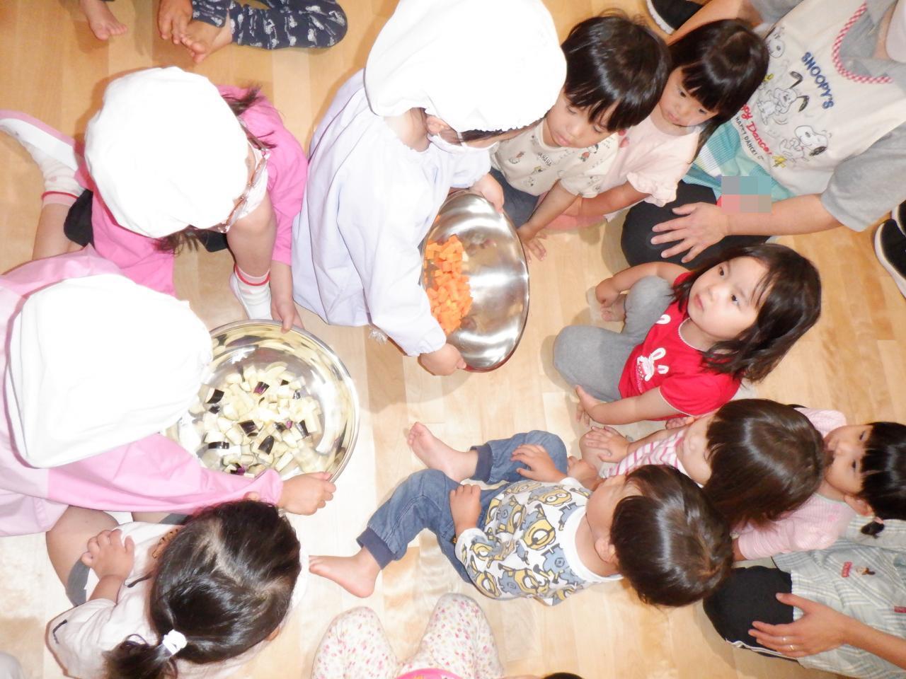 5歳児クラスの子どもたちも、カレーに入るお野菜を小さい組さんに持ってきて、小さくかがんで見せてくれました。