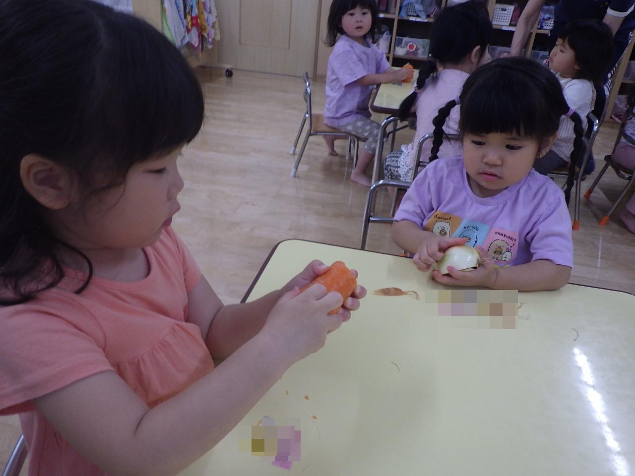 2歳児クラスでも、皮付きの野菜を皮付きのまま触ってみました。皮をむいてみたり、野菜を机の上でころがしてみたりしていました。どうやったらカレーになるのかな?