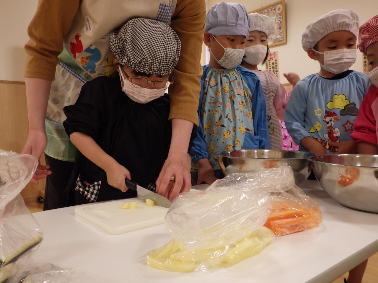 5歳児クラスは、これまでも調理手伝いとして包丁を使用していましたので、今日の「カレーパーティー」の主役・カレー🍛に入れるお野菜も慣れた手つきで切っていました。