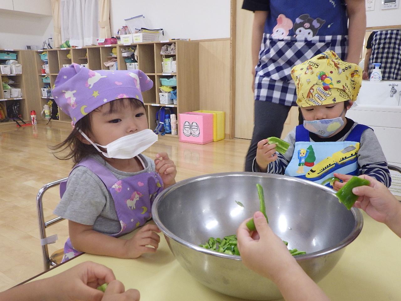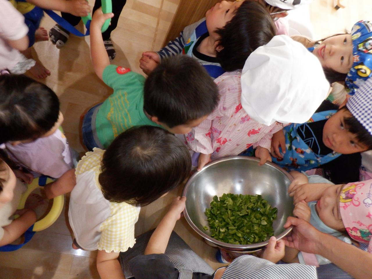 3歳児クラスは、自分たちで育てたピーマンを手で小さくちぎり、カレーでいただきます。