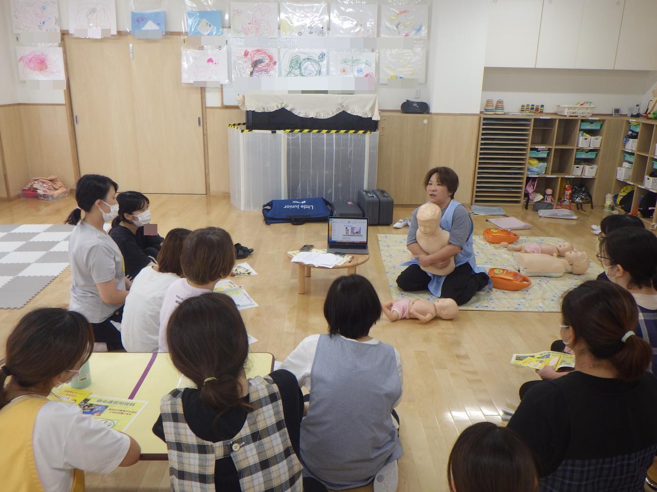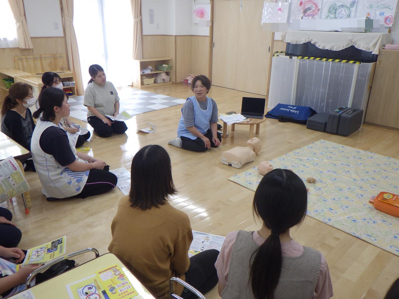 夏期には、プールや水遊びが始まりますので、枚方東消防署からお借りした訓練用のAEDと人形を使用して、看護師と救命救急普及員の職員が中心となり、研修を進めました。
