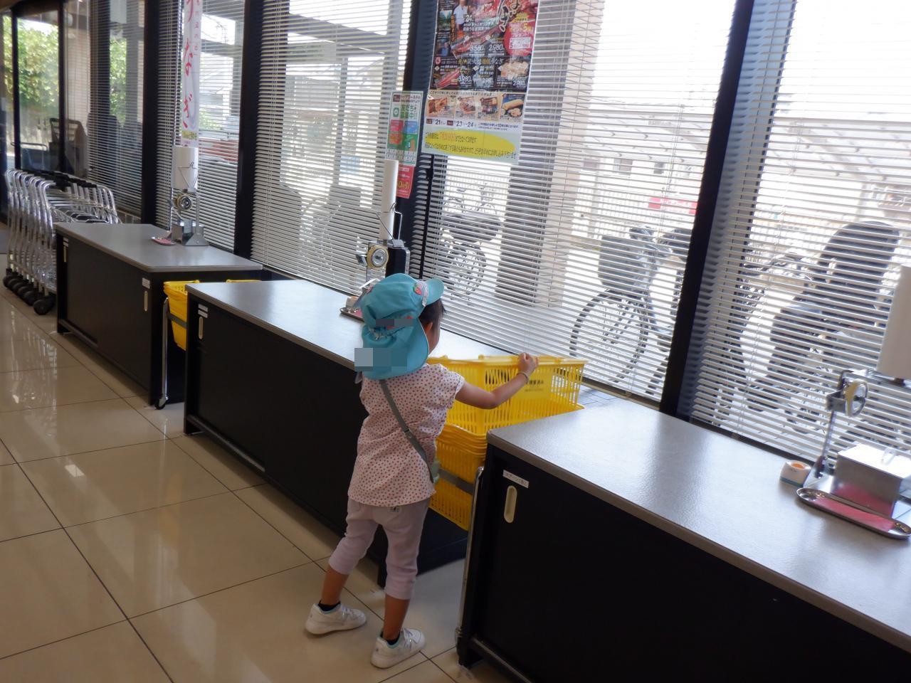 商品を袋に詰めたら、お買い物カゴを片付けて、おしまいです。