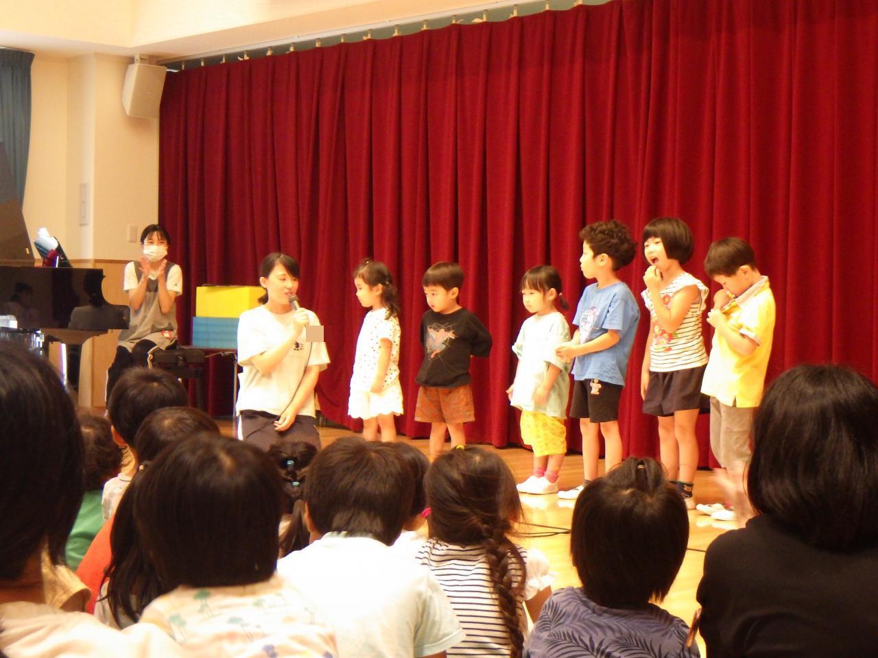 6月にお誕生日を迎えたお友だちに司会の先生からインタビューをしました。ひとりずつ、名前、年齢、好きな食べ物を聞いてみました。名前や年齢を言うときは、ちょっぴり恥ずかしそうな様子もありましたが、好きな食べ物を聞いてみると「もも🍑」「ポテトチップス🙂」と元気に答えていましたよ。