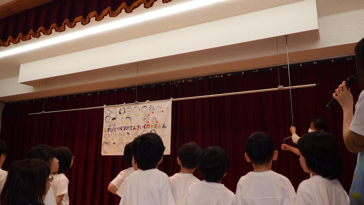 いよいよお泊まり保育当日。残念ながら午前中は雨☂が降っていたので、「はじまりの会」はお遊戯室で行いました。手作りのおそろいTシャツを着た5歳児の子どもたちが見守る中、旗がお遊戯室の天井近くまで上がっていきました✨。