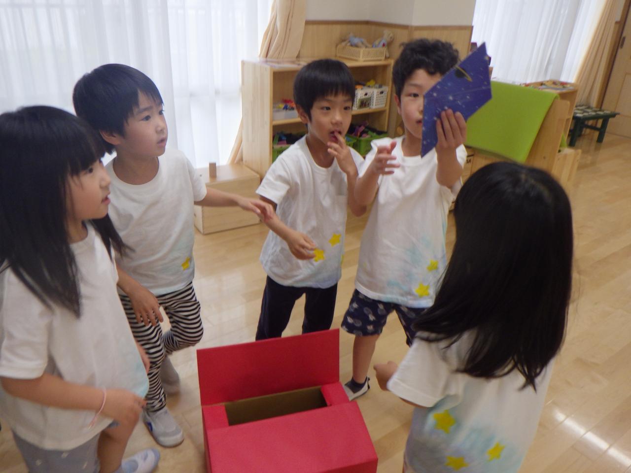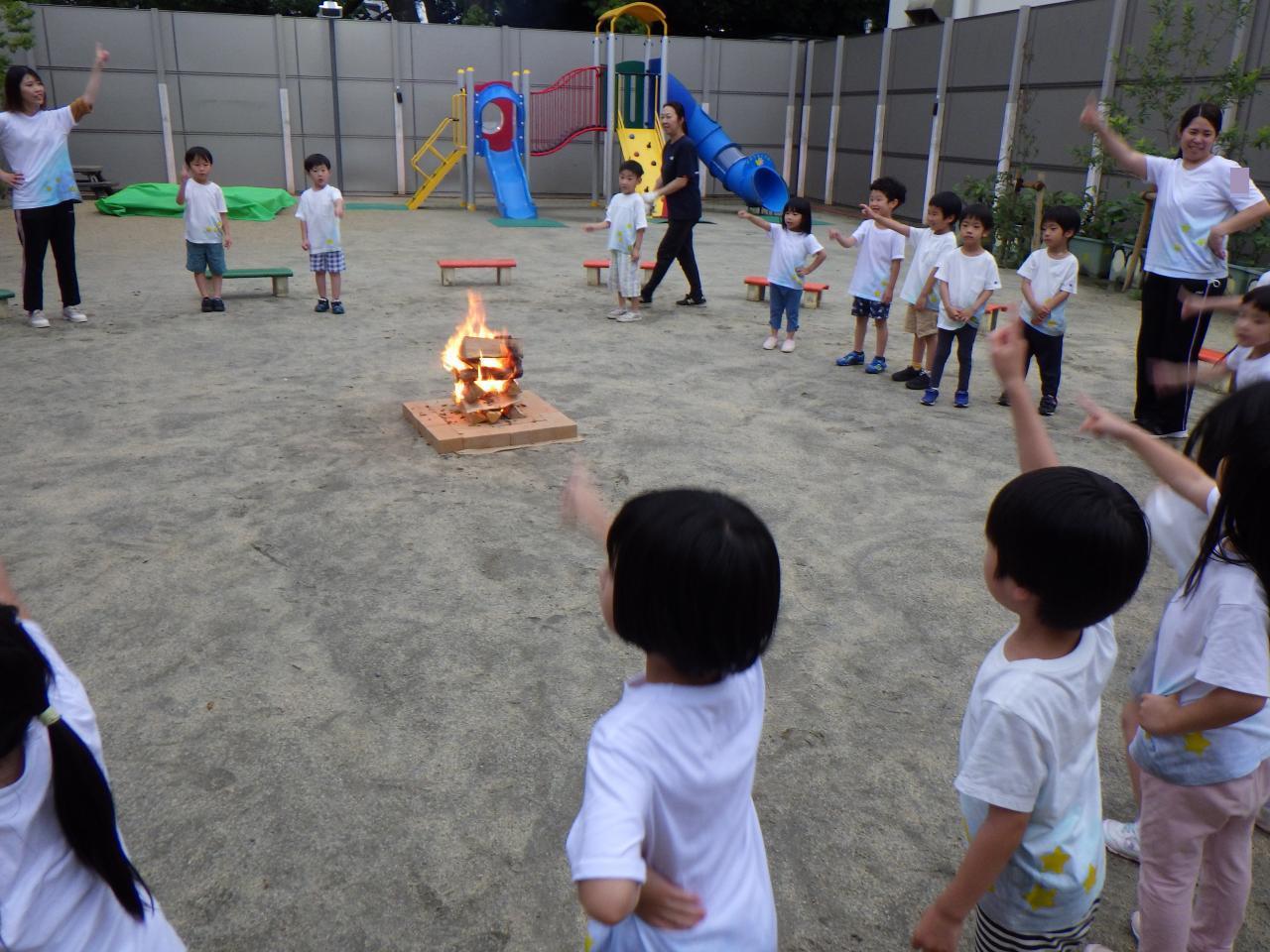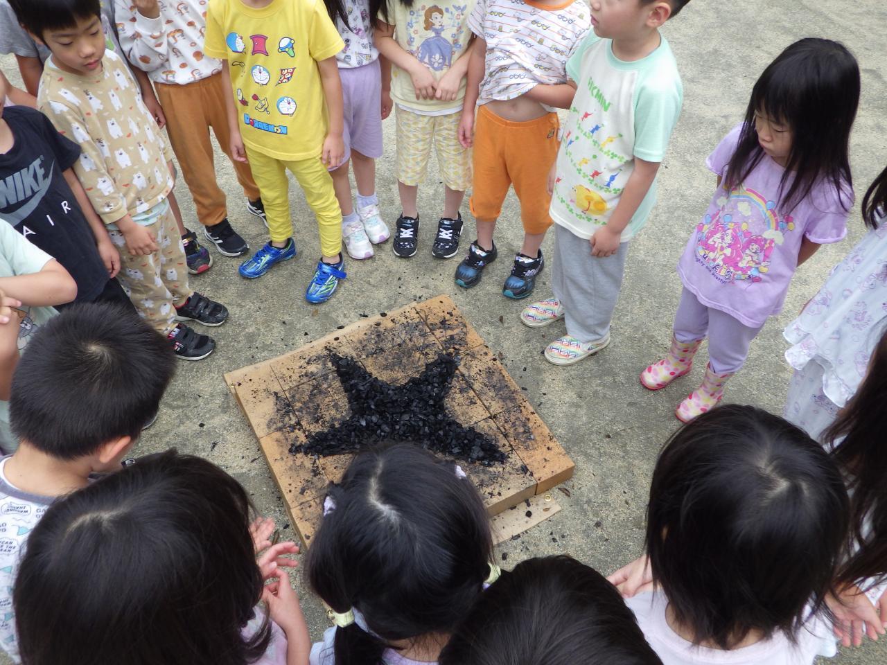 朝になりました。「おはようございます❗」まずは園庭をお散歩しました。園庭のプランターに植えた、ピーマンやなすびが大きくなっているのを発見❗早速みんなで収穫をしました。そして昨日のキャンプファイヤーの跡が星の形に✨「星の形になってる!」「不思議やな」「わんぱくだんがしたのかな」と、子どもたち。目もしっかり覚めたようです。