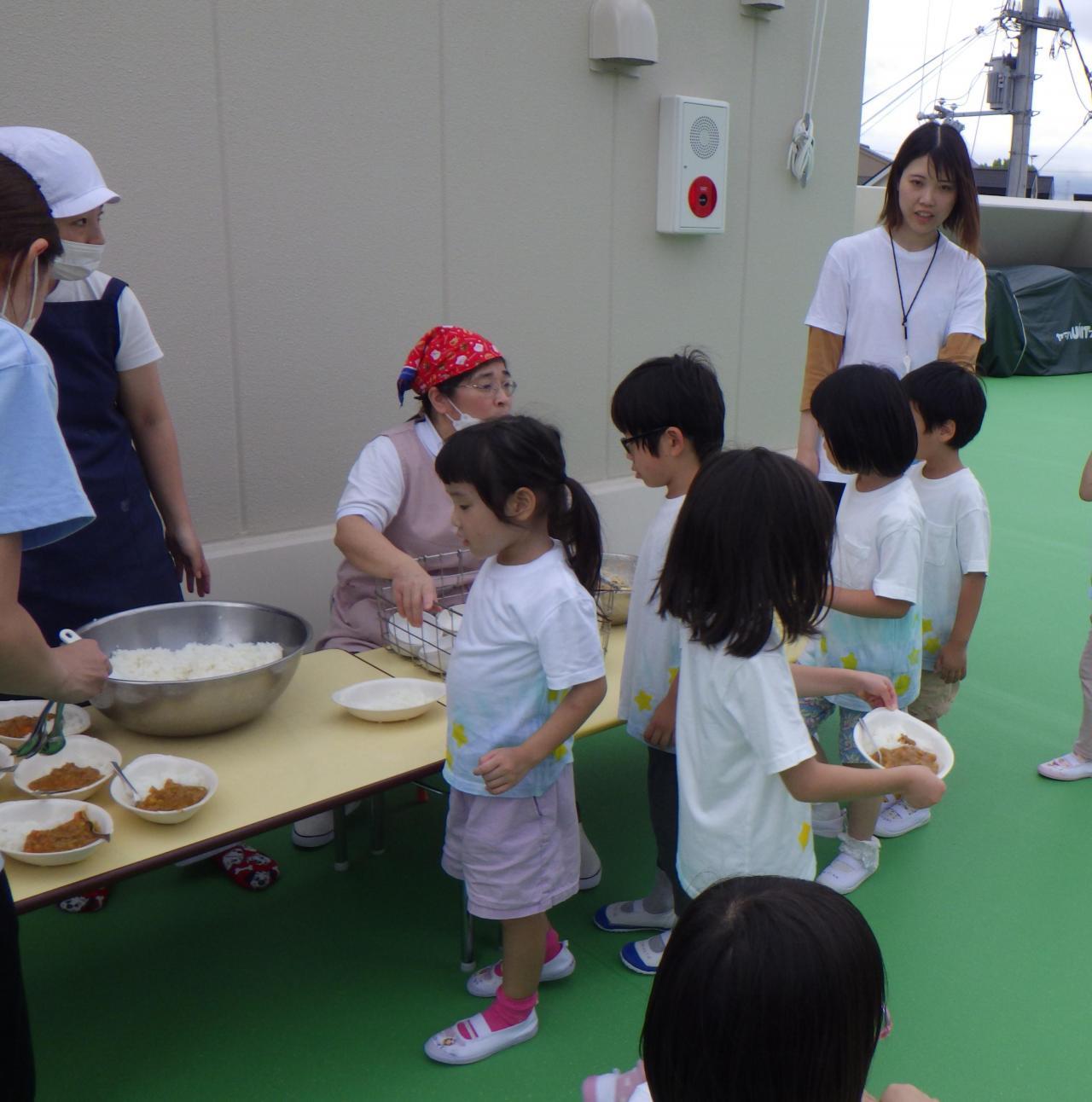 お当番活動をした後は、お腹が空いてきました。いよいよ楽しみにしていた夕食の時間。キラキラテラスでいただくメニューは5歳児クラスのみんなで話し合って決めた「カレーライス」と「マカロニサラダ」です。サラダのマカロニはリボン型というのがポイントで、ゆでたまごも入っています💝。