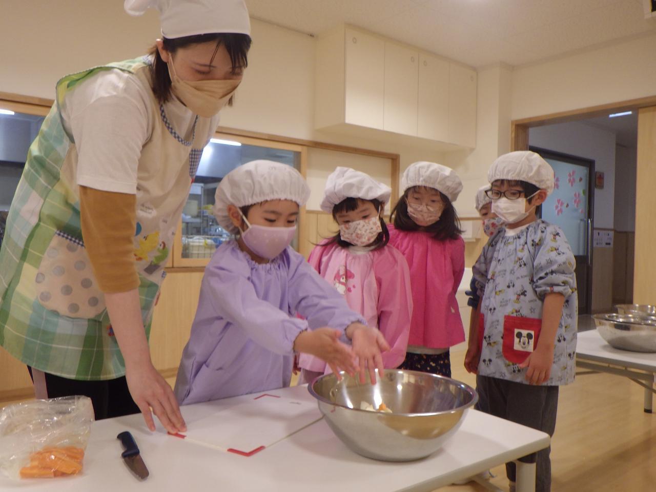 エプロンやマスクなど、準備ができたらランチルームに移動し調理手伝い‼お米を研ぐと、「お米ってきもちいい!」『ねこの手』で手を切らないよう気をつけながら野菜を切りました。