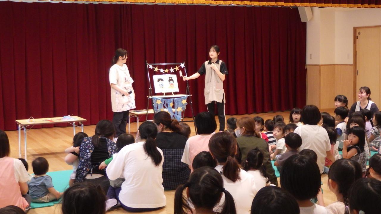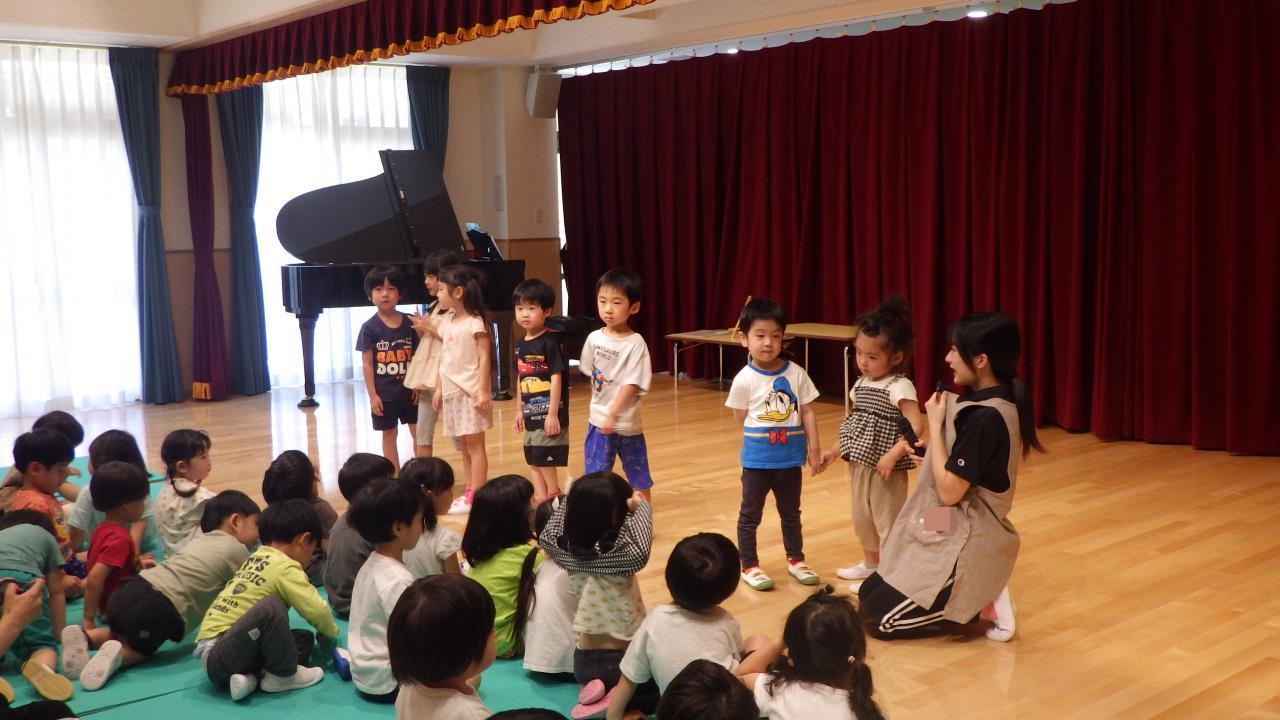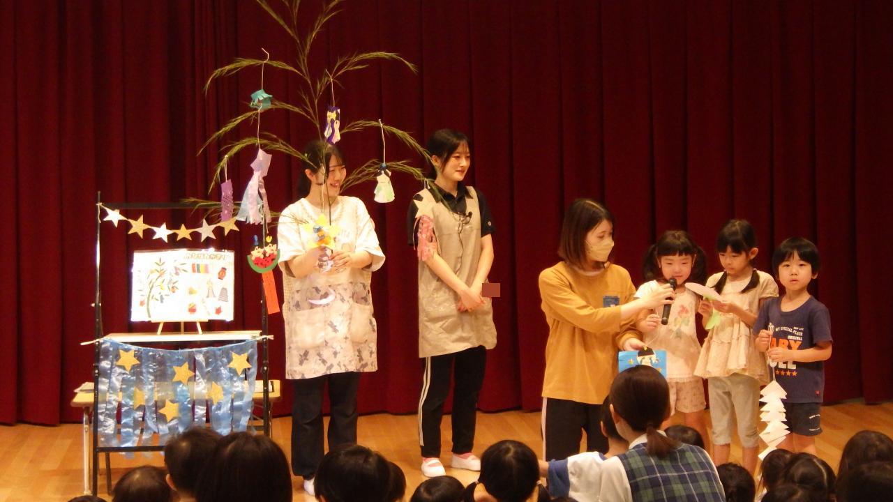 幼児クラスの7月の誕生会では、7月の誕生日のお友だちに「願いごとは何ですか?」「好きな食べ物は何ですか?」と、ひとりひとりインタビューをしました。七夕クイズをしたり「七夕」の歌を歌ったりと、楽しい時間を過ごしました。