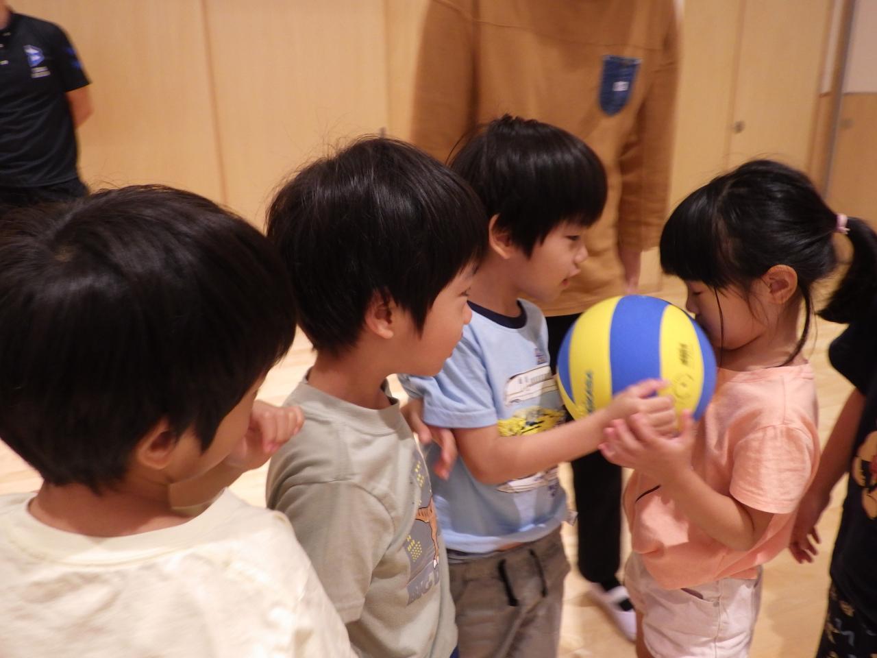 選手の方々の楽しい自己紹介で、子どもたちも笑顔になり、早速バレーボールを使ったゲームを行いました。まずは2人ひと組になり『ボール取りゲーム』です。「ボール」と言ったらボールを取るのですが「あし‼」「あたま‼」と言われたら足や頭をタッチしたり、「うさぎさん!」と言ったらうさぎの真似をしたりと大忙し💦でした。