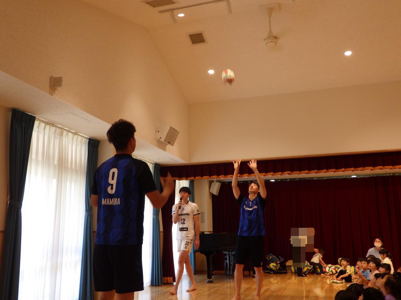 選手の方々のラリーも見せていただきました✨天井につきそうなくらい高くあがるボールに、子どもたちも「すごーい❗」「たかーい👏」と、大興奮でした💨
