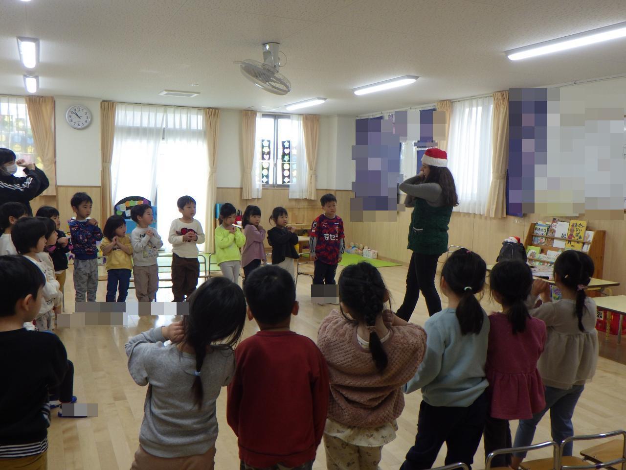 【英語あそび】12月のECCの英語あそびでは、4歳児、5歳児クラスに外国人の先生のキャサリン先生が来てくださいました。子どもたちはドキドキ💦